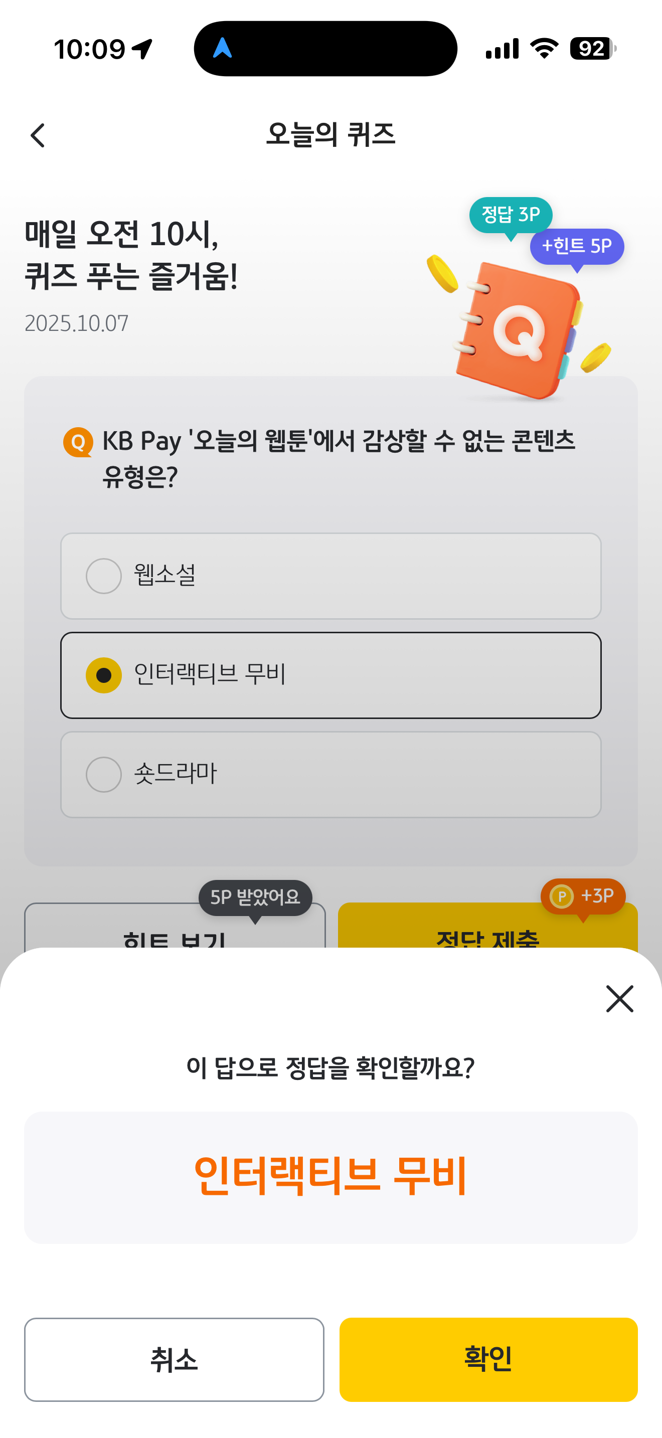 KB pay 오늘의 퀴즈 정답은 인터랙티브 무비 입니다