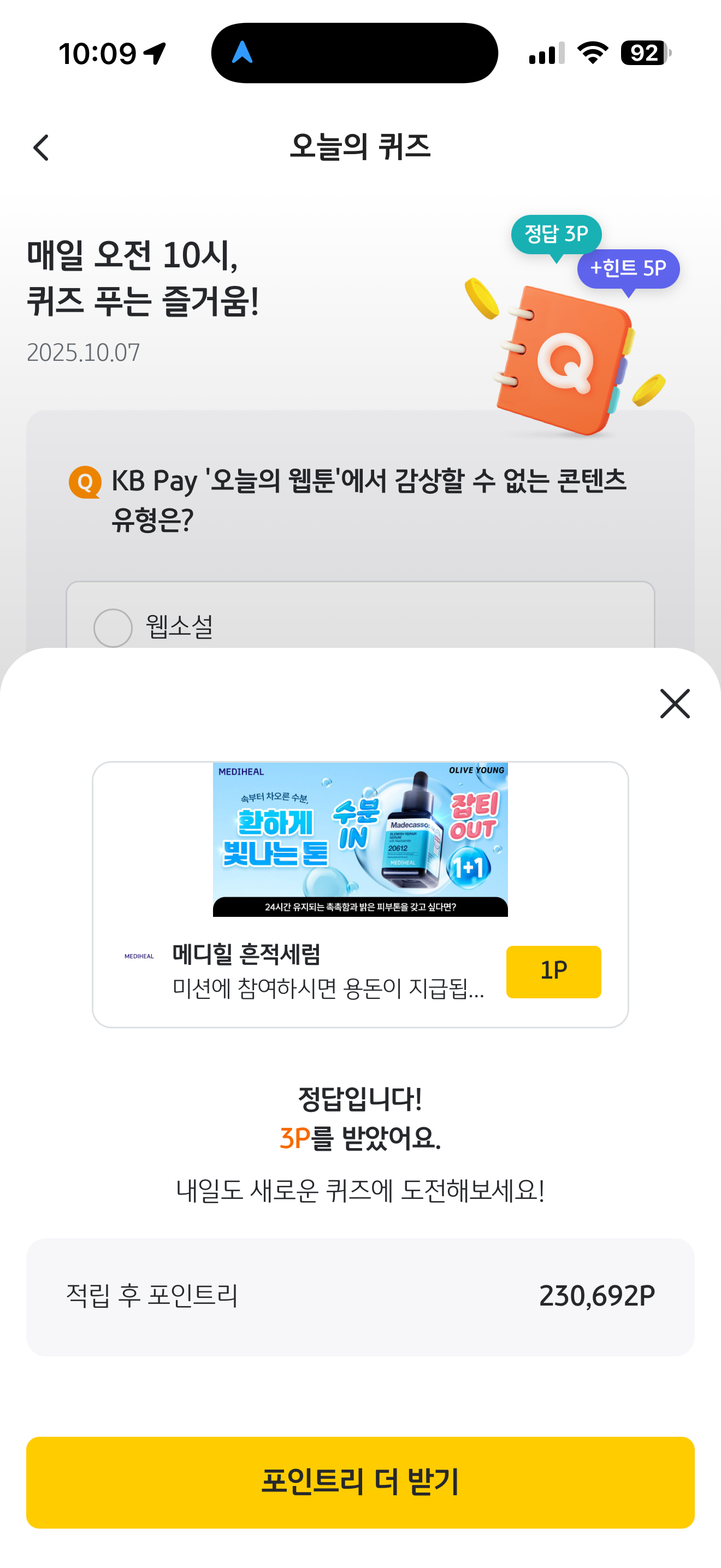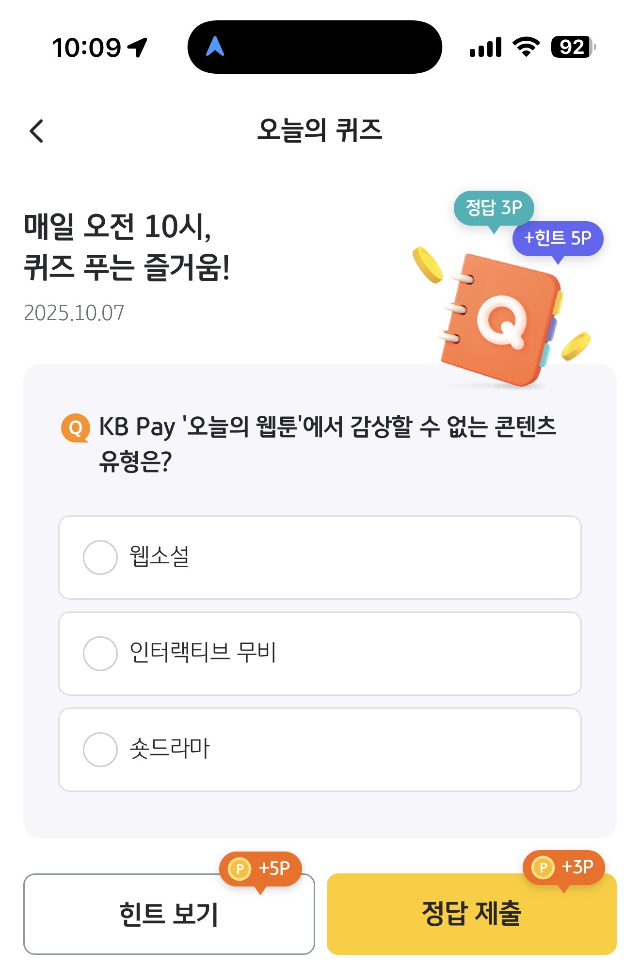 KB Pay '오늘의 웹툰'에서 감상할 수 없는 콘텐츠 유형은? 보기는 1. 웹소설 2. 인터랙티브 무비 3. 숏드라마 입니다. 오늘의 웹툰 서비스가 있어 다양한 웹툰을 감상할 수 있습니다. 과연 콘텐츠 유형은 어떤 것인지 참고해서 활용해 보세요