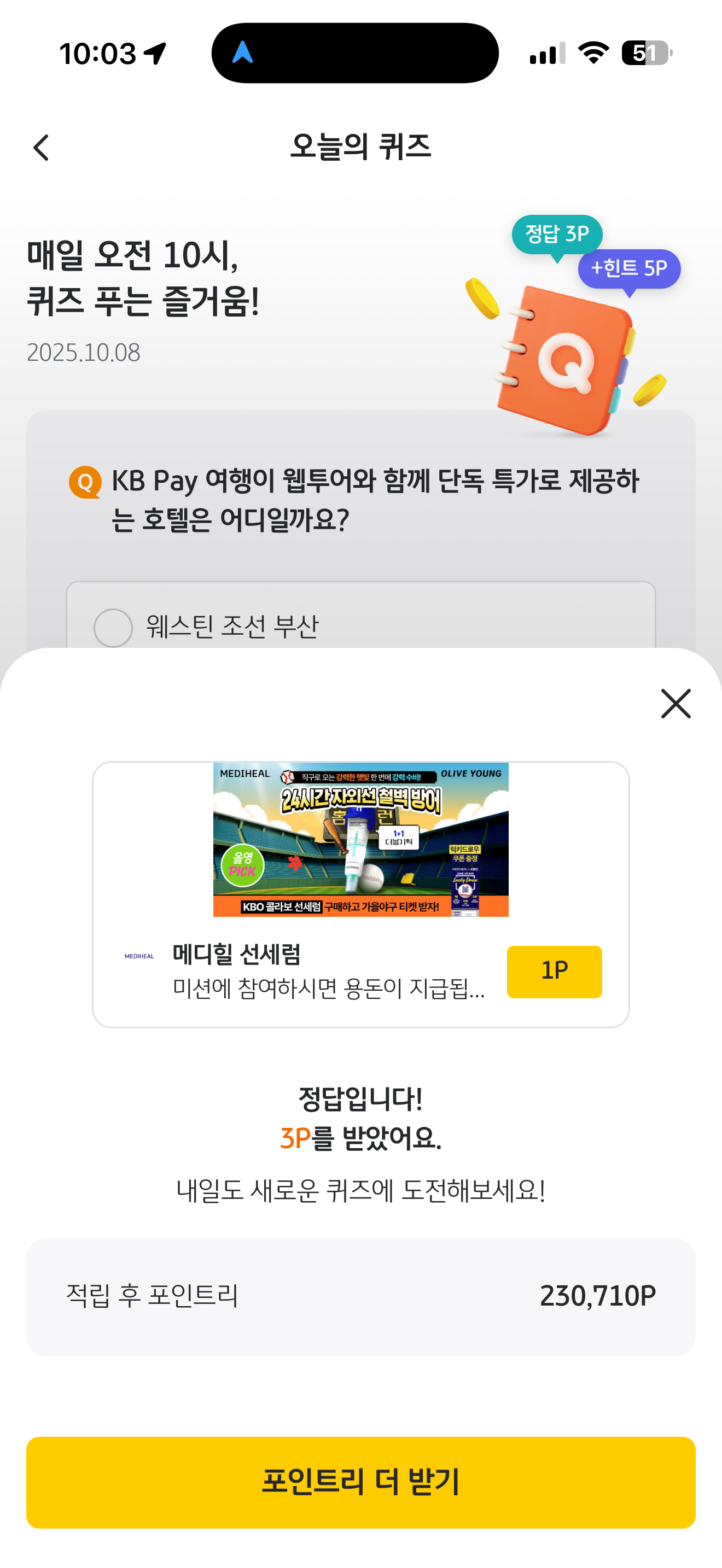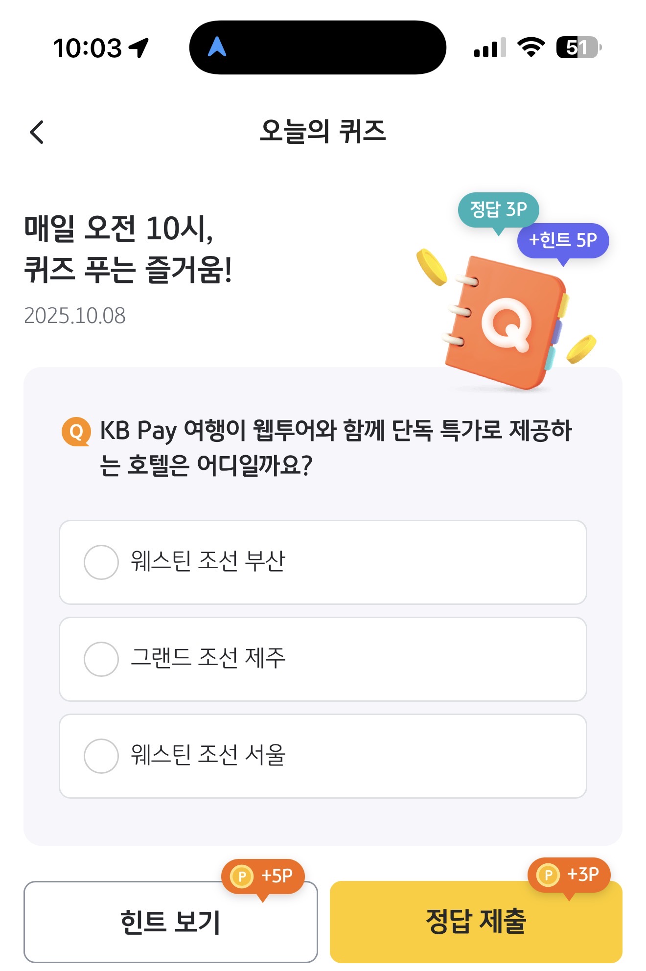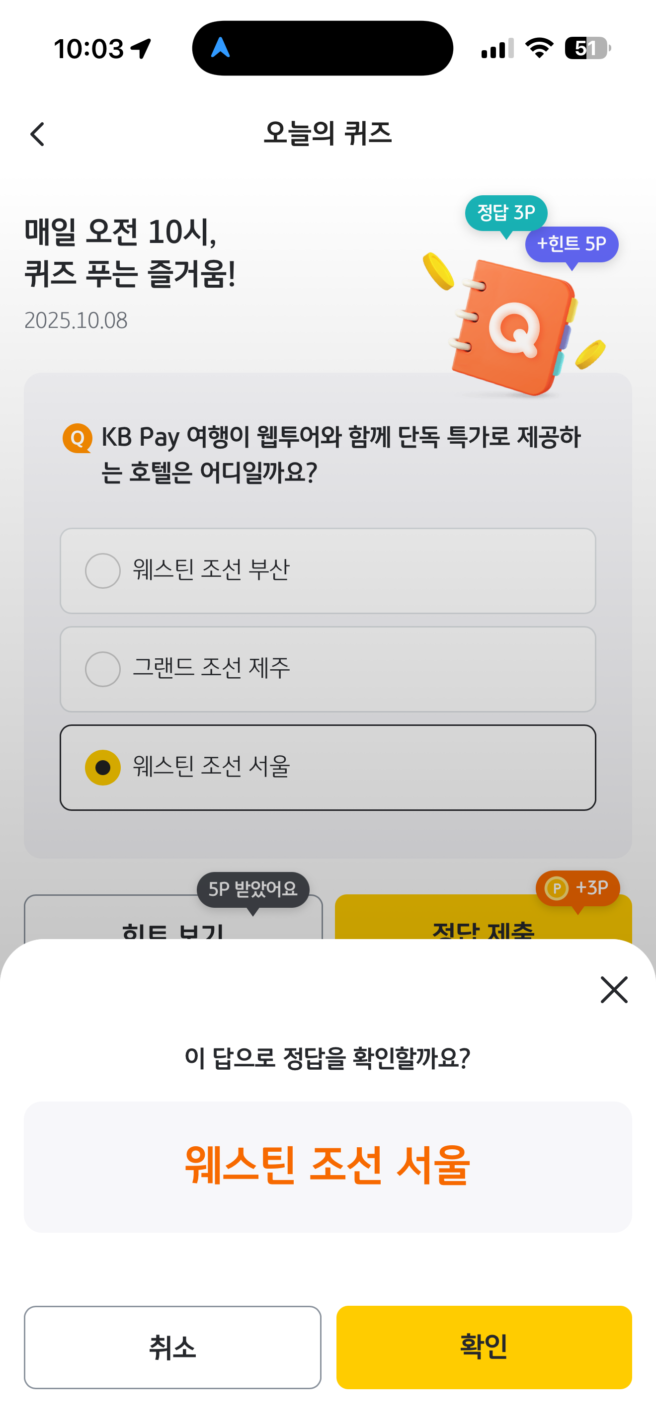 KB Pay 오늘의 퀴즈 정답은 웨스틴 조선 서울 입니다