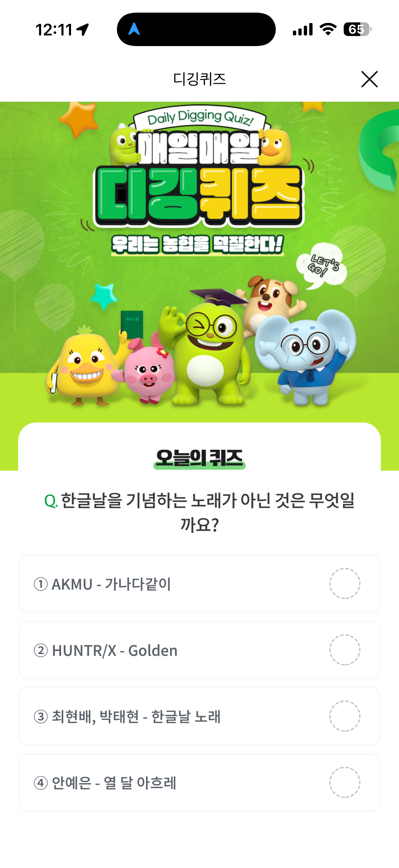 한글날을 기념하는 노래가 아닌 것은 무엇일까요? 보기는 1. AKMU - 가나다같이 2. HUNTR/X - Golden 3. 최현배, 박태현 - 한글날 노래 4. 연예은 - 열 달 아흐레 입니다. 한글날을 맞아 다양한 노래들이 있는데요. 잘 참고해 보세요