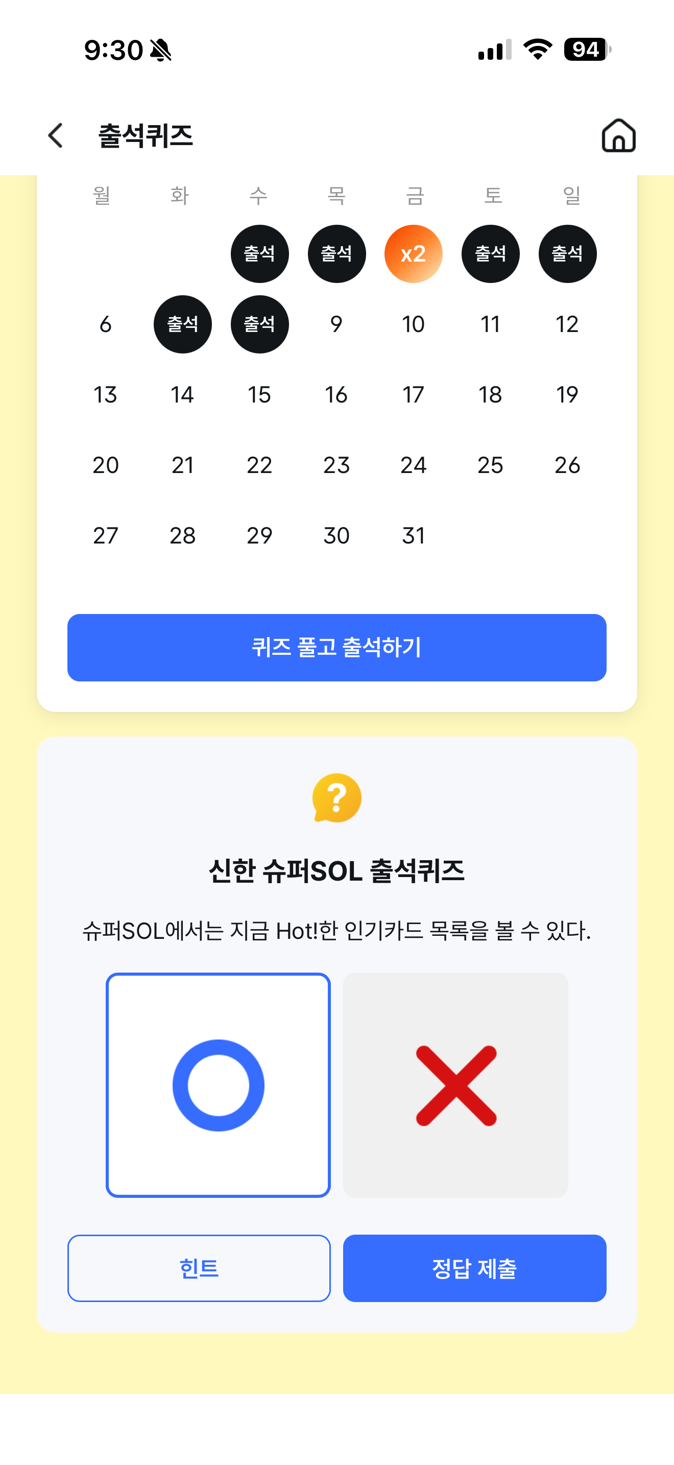 신한 슈퍼SOL 출석퀴즈 정답은 O 입니다