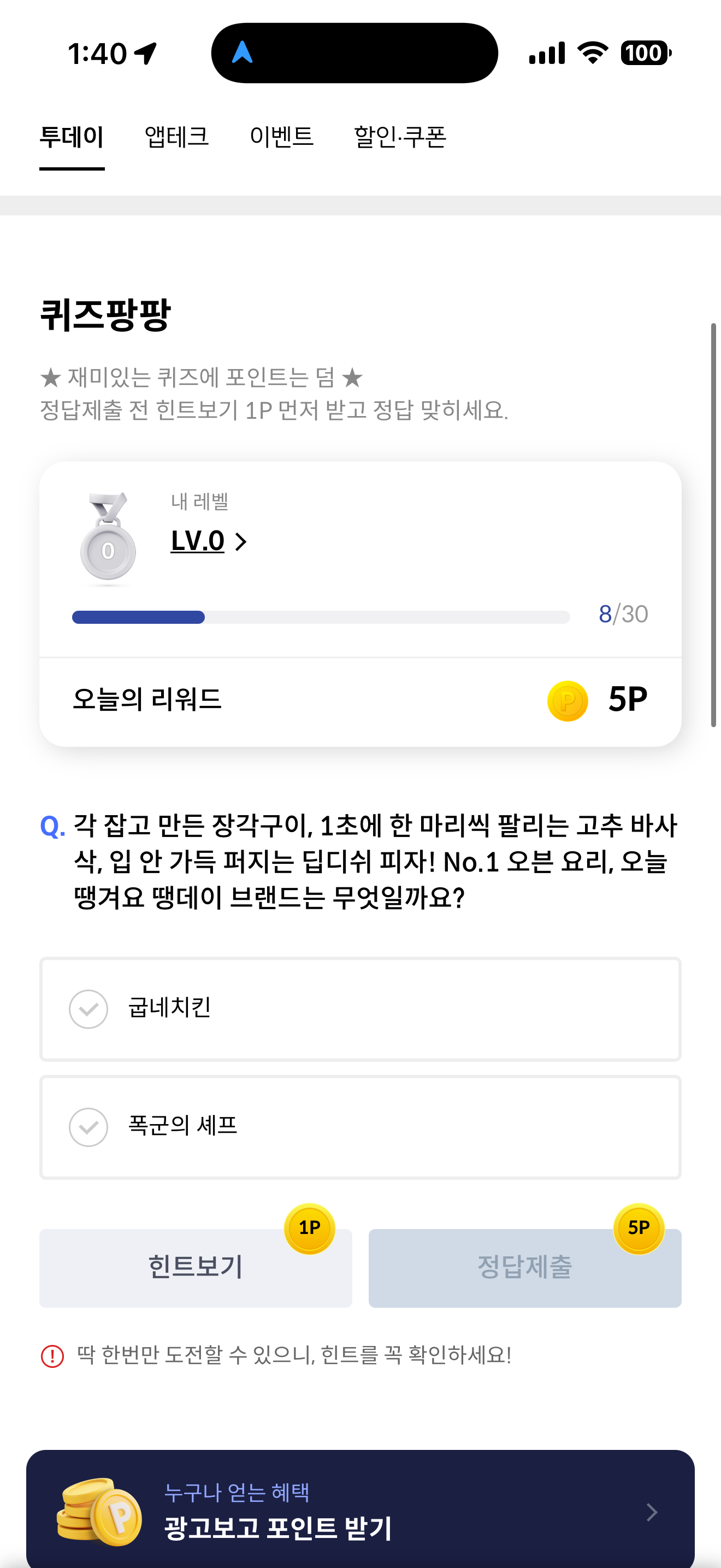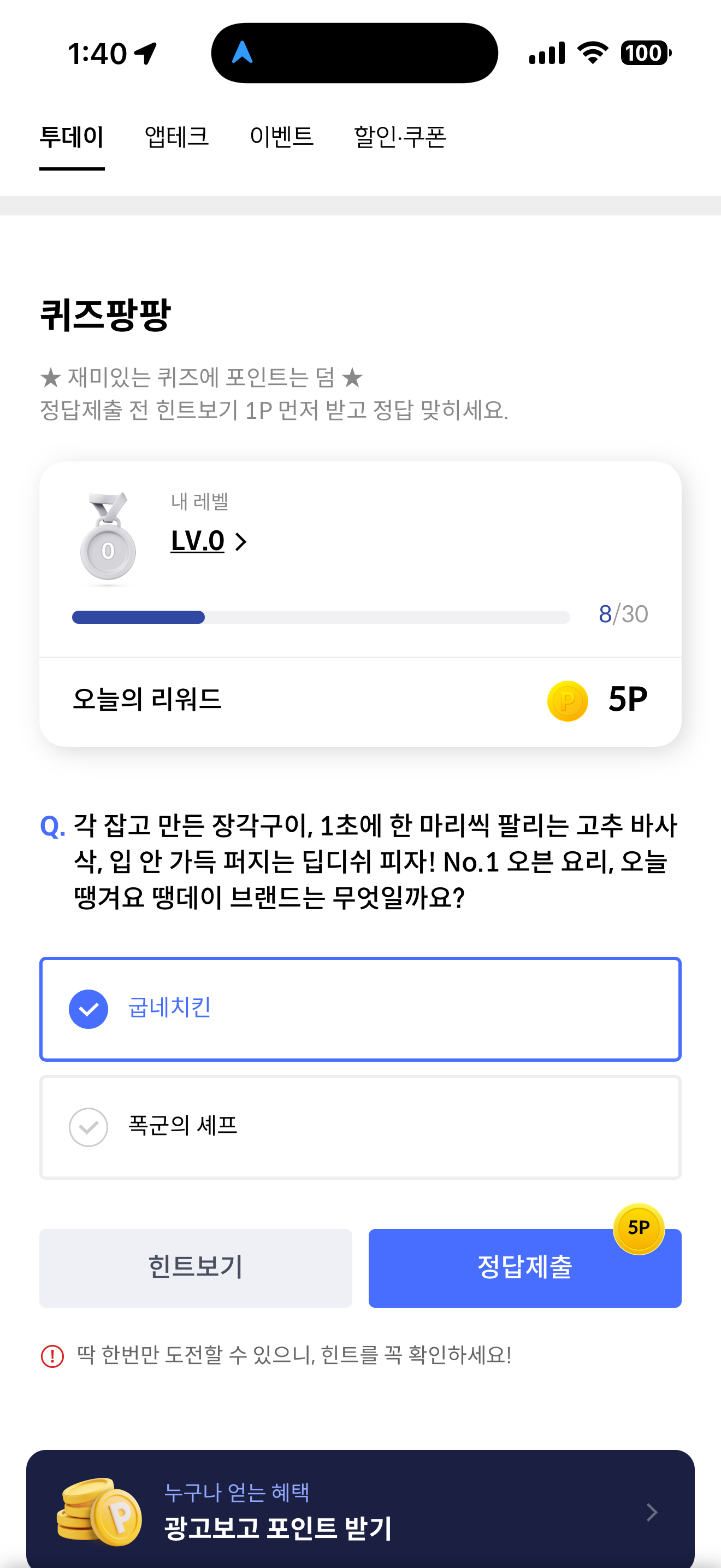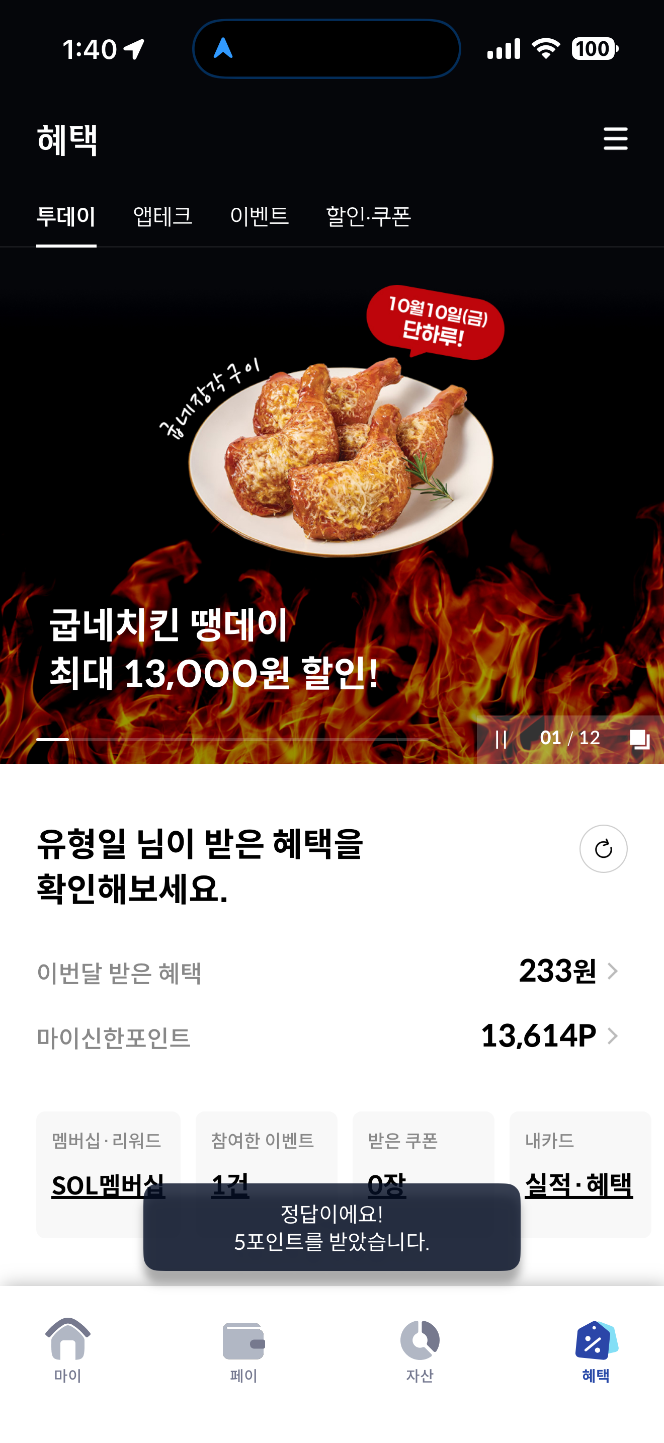 신한카드 퀴즈팡팡 정답은 굽네치킨 입니다