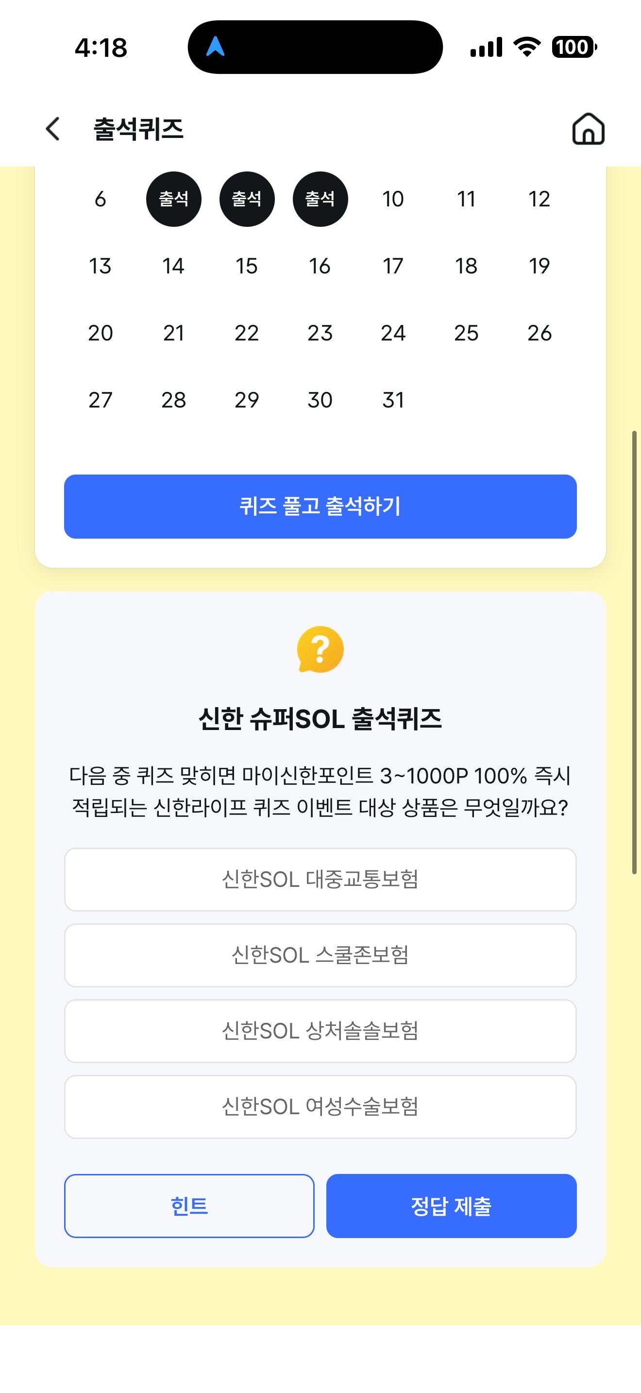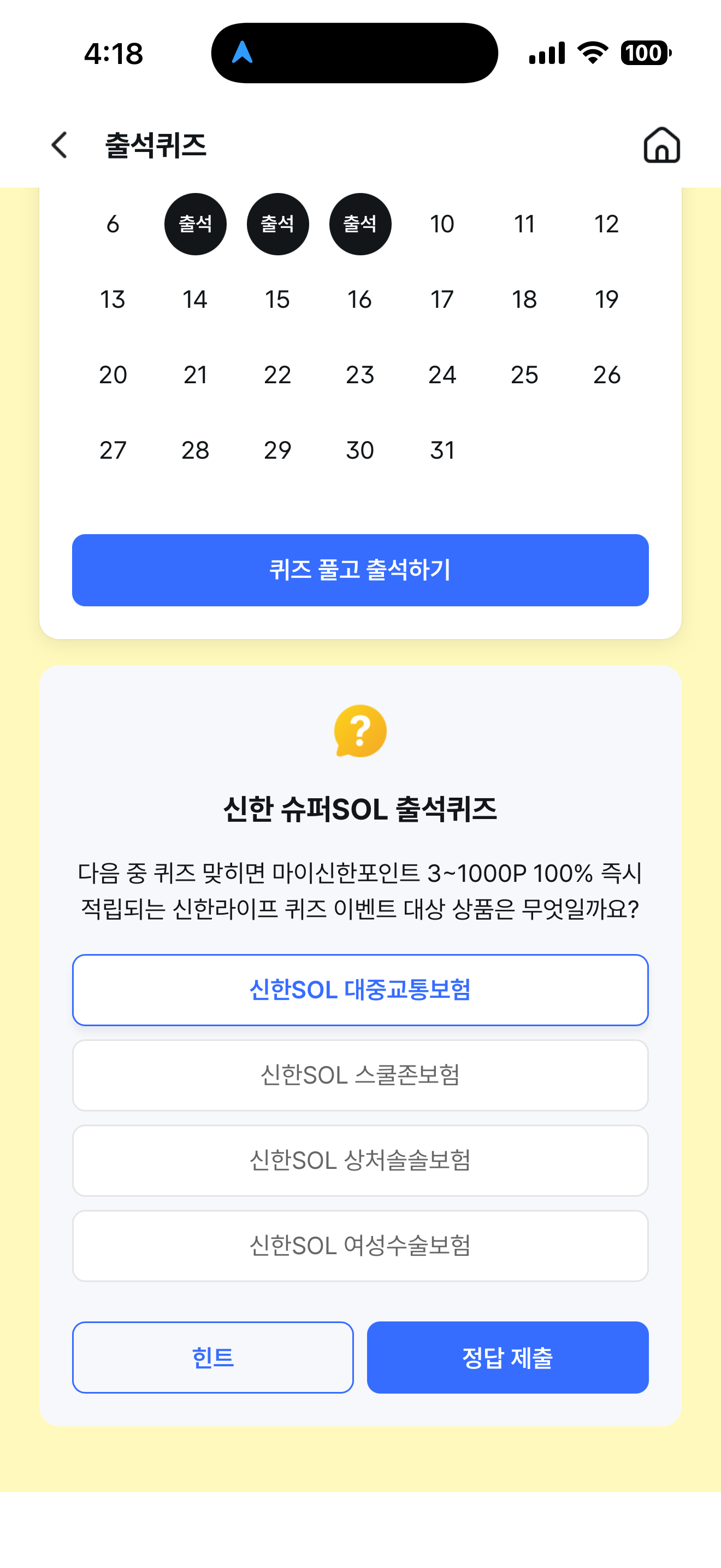 신한 슈퍼SOL 출석퀴즈 정답은 신한SOL 대중교통보험 입니다