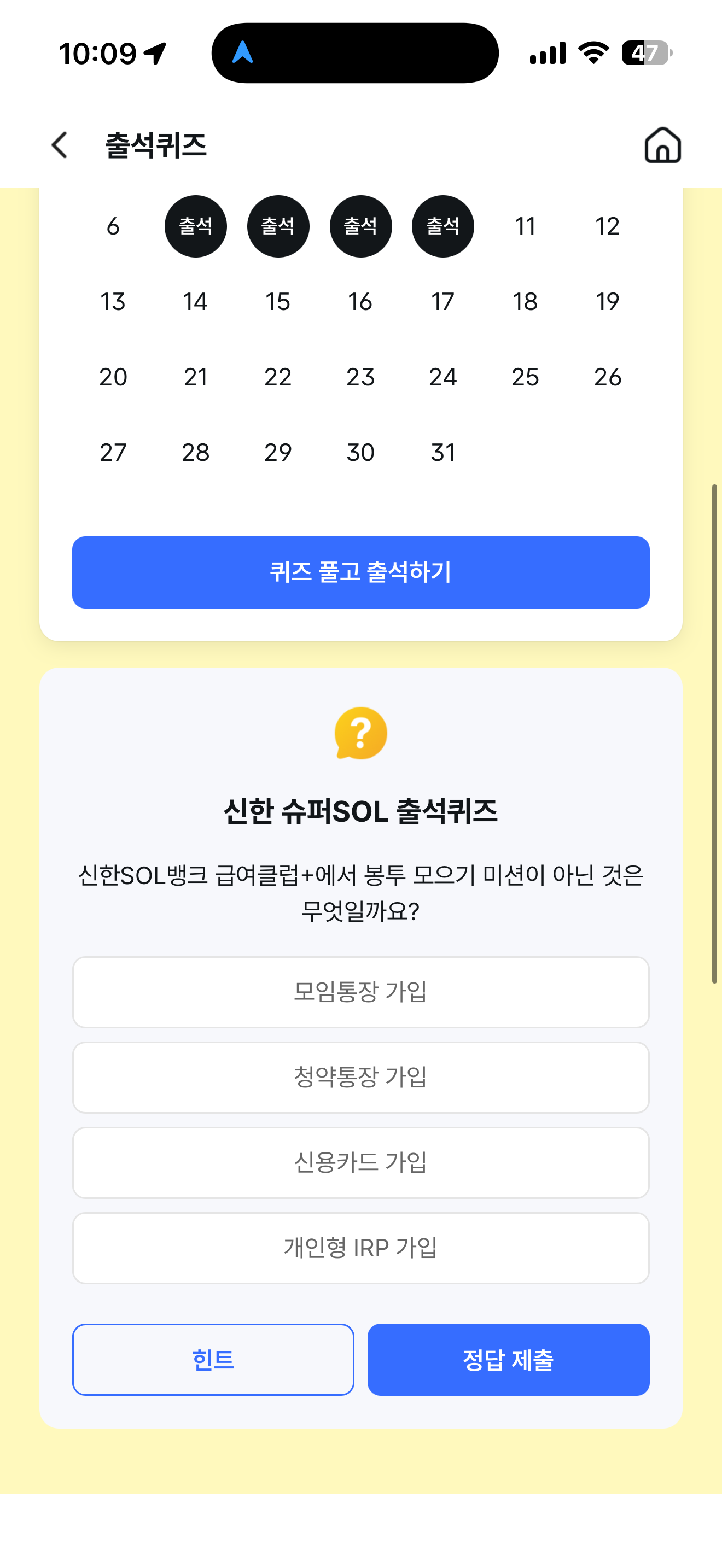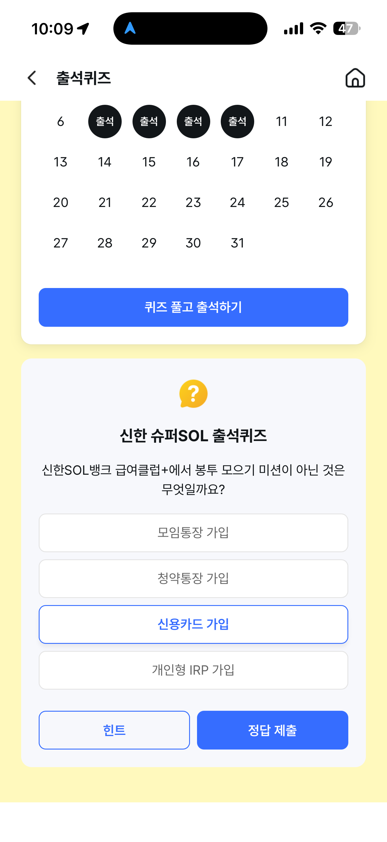 신한 슈퍼SOL 출석퀴즈 정답은 신용카드 가입 입니다