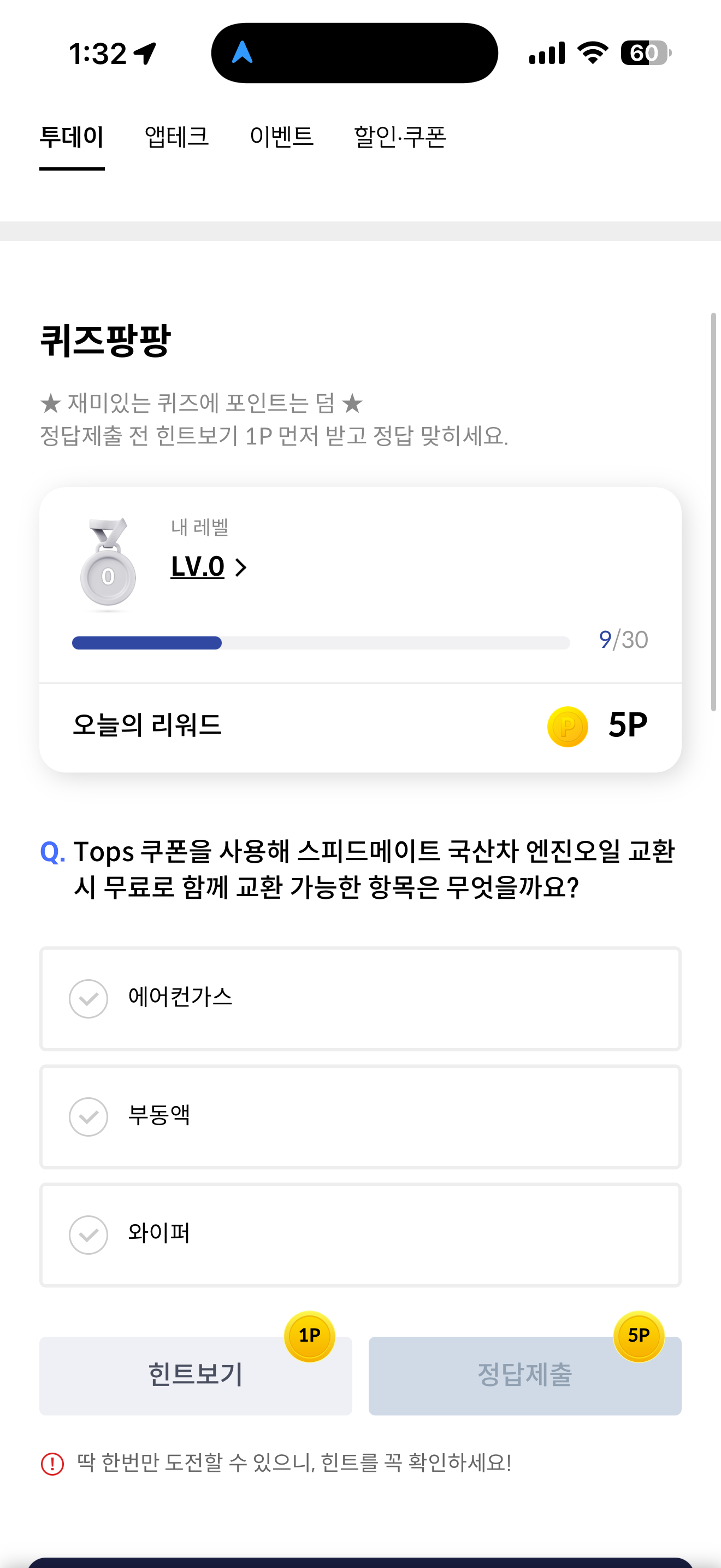 Tops 쿠폰을 사용해 스피드메이트 국산차 엔진오일 교환시 무료로 함께 교환 가능한 항목은 무엇일까요? 보기는 1. 에어컨가스 2. 부동액 3. 와이퍼 입니다. Tops 쿠폰을 사용해 무료로 교환 가능한 항목이 있으니 잘 참고해서 활용해 보세요