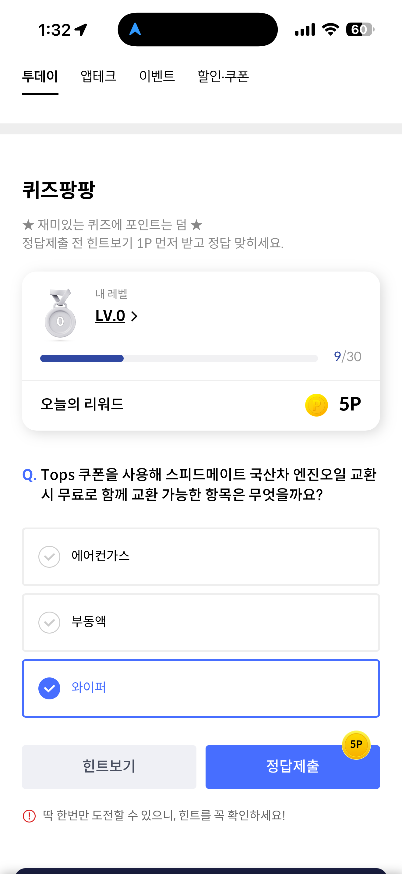 Tops 쿠폰을 사용해 스피드메이트 국산차 엔진오일 교환시 무료로 함께 교환 가능한 항목은 무엇일까요? 보기는 1. 에어컨가스 2. 부동액 3. 와이퍼 입니다. Tops 쿠폰을 사용해 무료로 교환 가능한 항목이 있으니 잘 참고해서 활용해 보세요