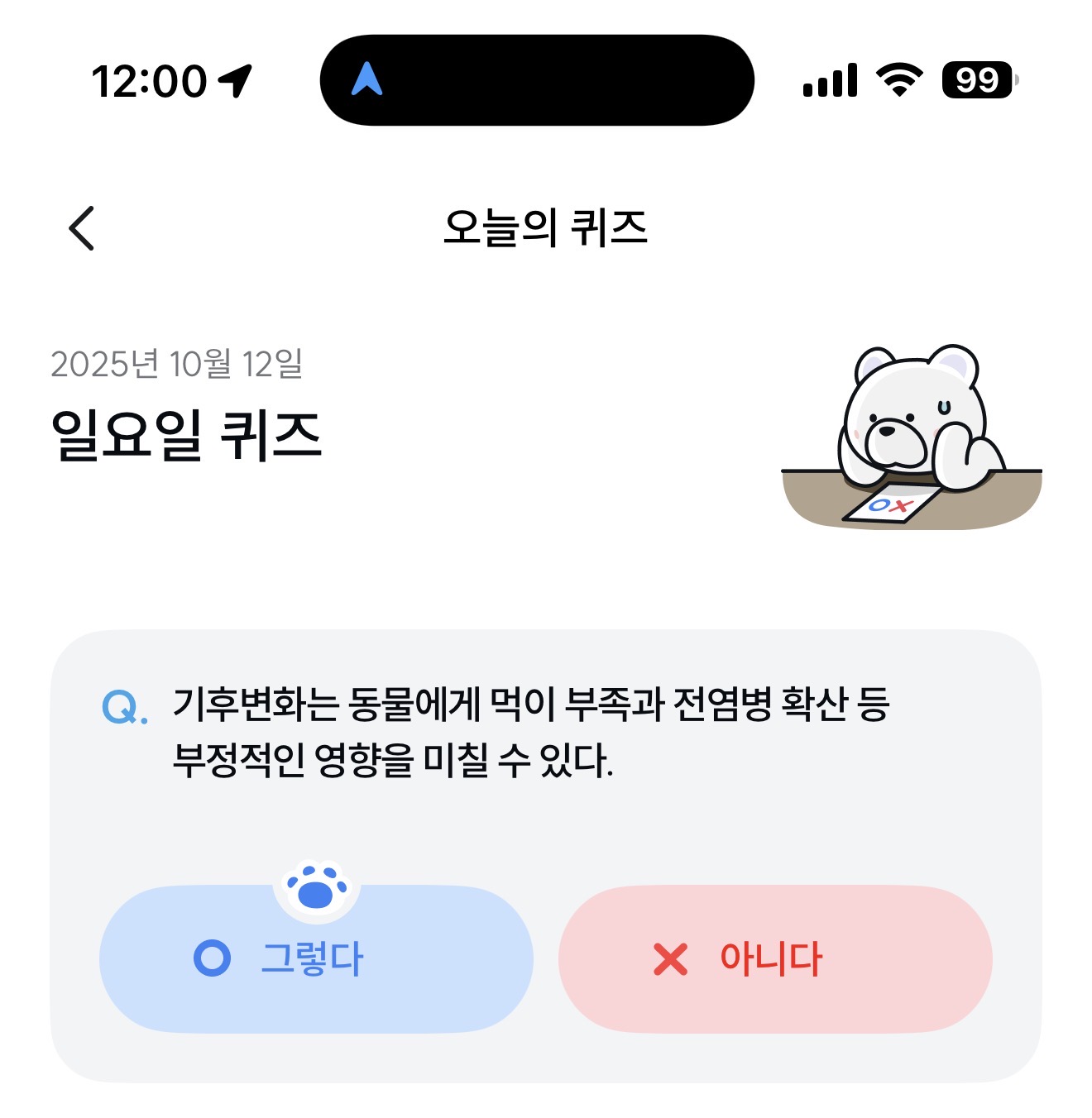 기후변화는 동물에게 먹이 부족과 전염병 확산 등 부정적인 영향을 미칠 수 있다. 그렇다 아니다 선택하면 되는데요. 기후변화는 동물에게 먹이 부족 현상을 가져올까요? 그리고 전염병 확산 등도 생길까요? 영화에서도 많이 봤던 내용이죠. 과연 기후변화가 가져올 영향은 어떻게 될까요?