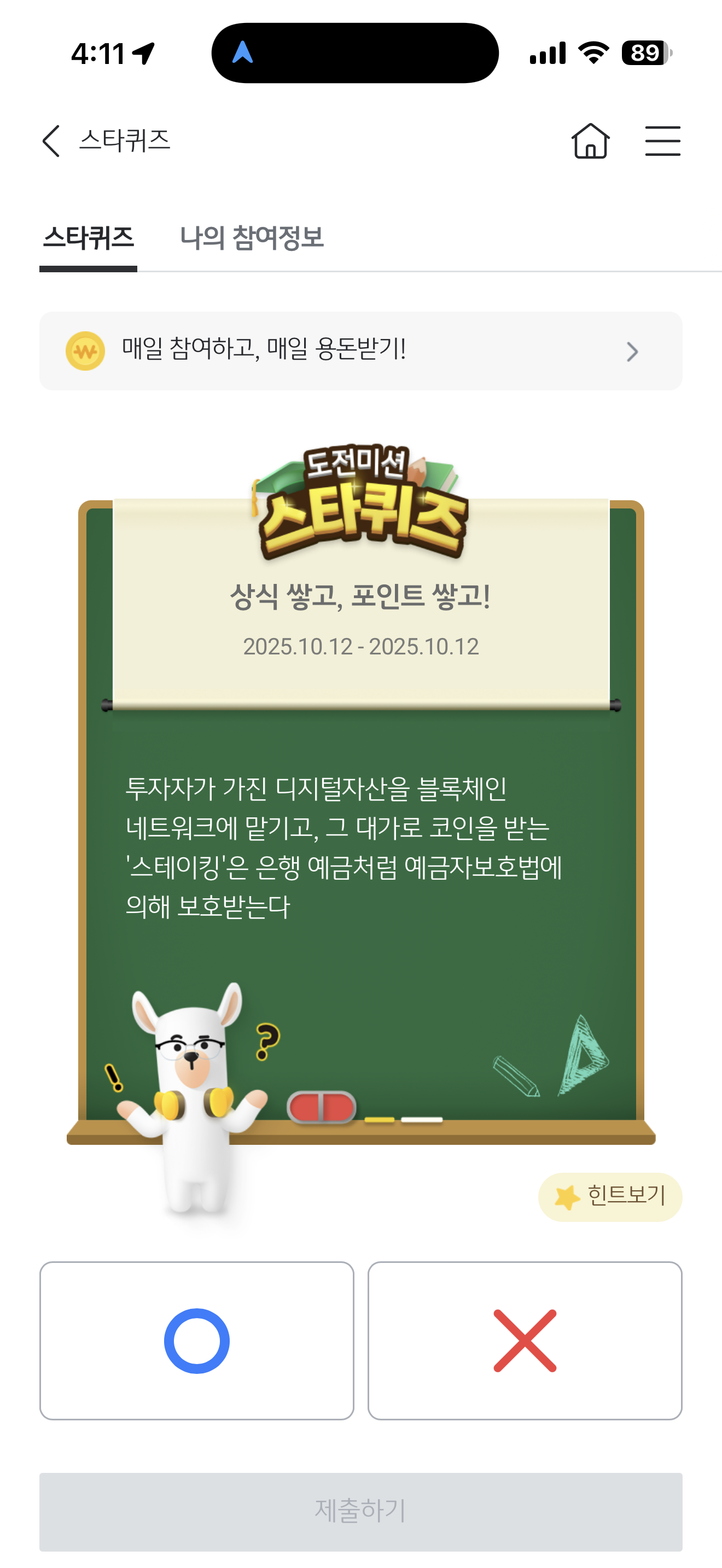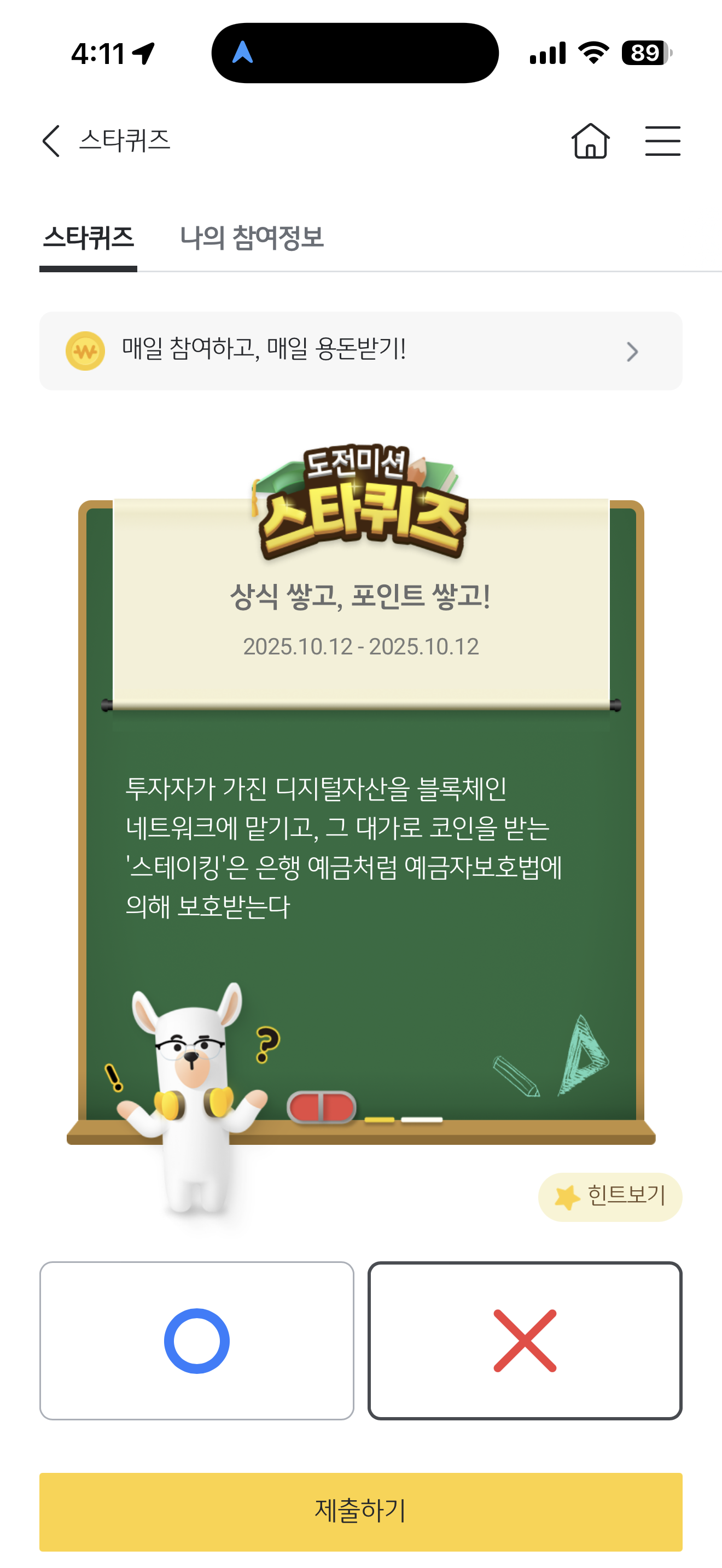 투자자가 가진 디지털자산을 블록체인 네트워크를 맡기고, 그 대가로 코인을 받는 '스테이킹'은 은행 예금처럼 예금자보호법에 의해 보호받는다 O, X 퀴즈인데요. 디지털 자산을 블록체인 네트워크를 맡기고 코인을 받는 이런 서비스가 있을까요?