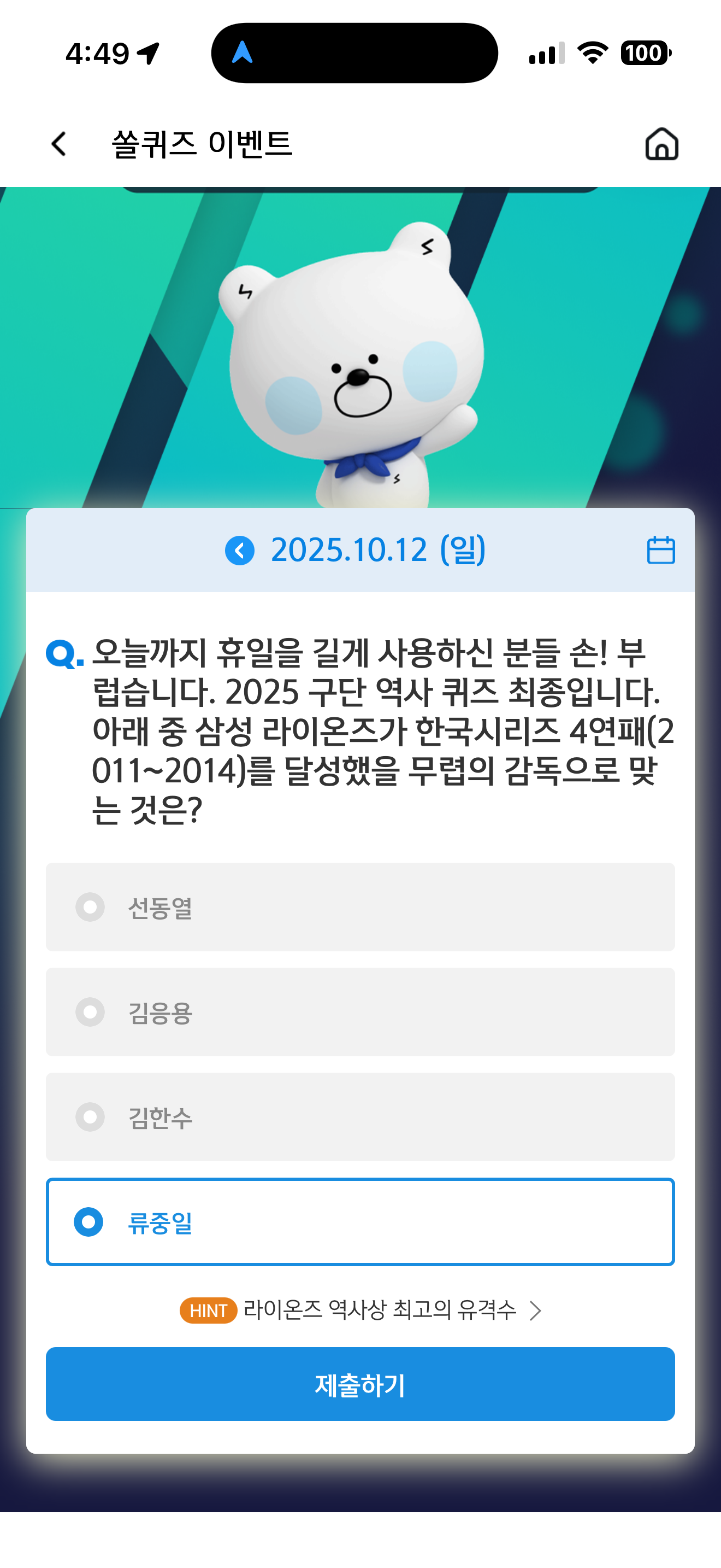 오늘까지 휴일을 길게 사용하신 분들 손! 부럽습니다. 2025 구단 역사 퀴즈 최종입니다. 아래 중 삼성 라이온즈가 한국시리즈 4연패(2011~2014)를 달성했을 무렵의 감독으로 맞는 것은? 보기는 1. 선동열 2. 김응용 3. 김한수 4. 류중일