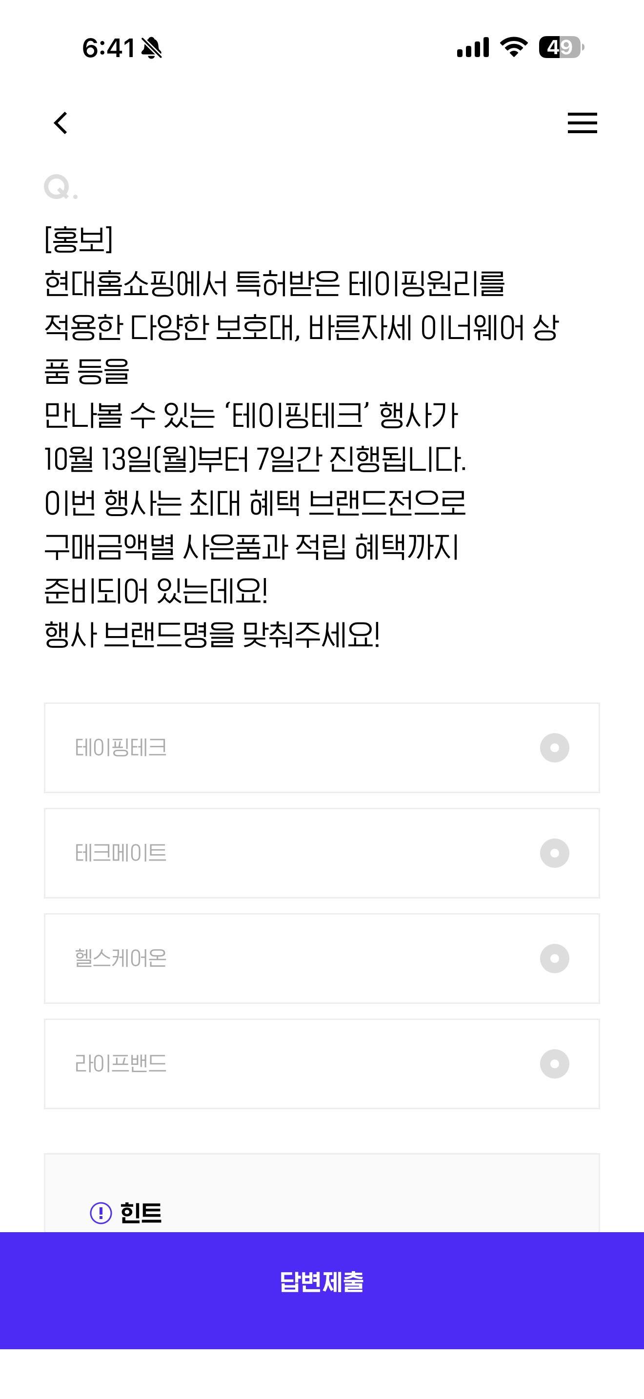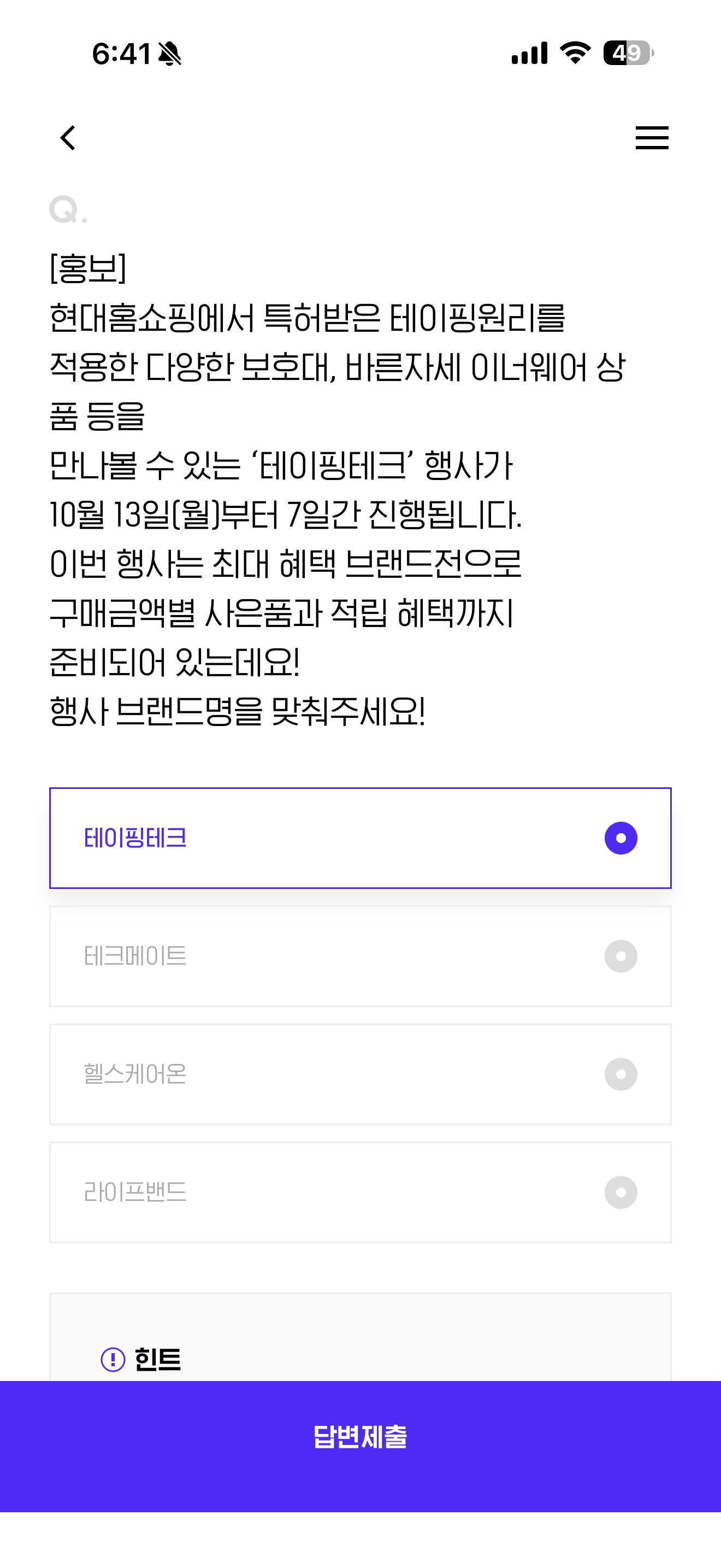 H포인트 퀴즈 정답은 테이핑테크 입니다