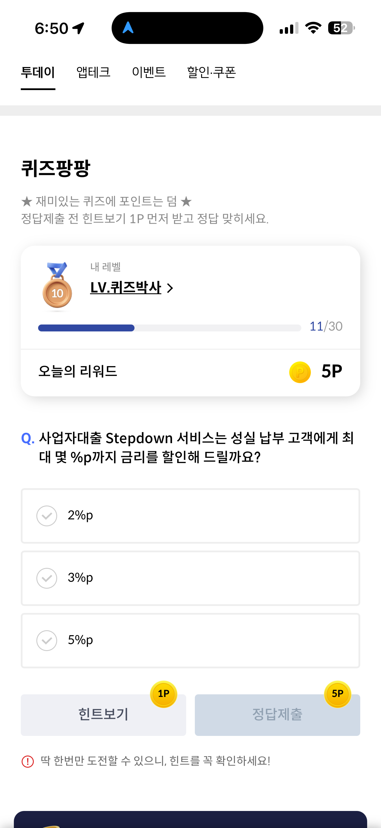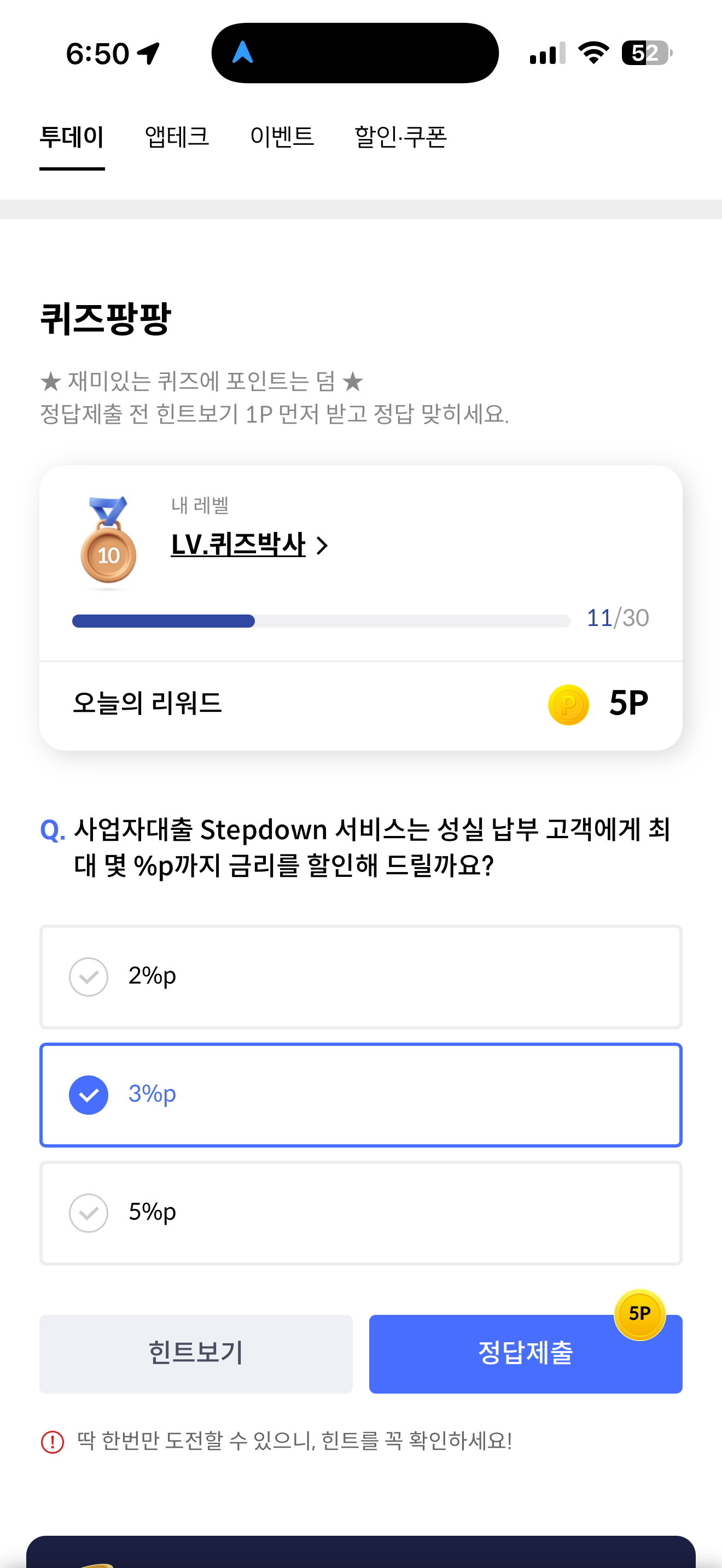 신한카드 퀴즈팡팡 정답은 3%p 입니다