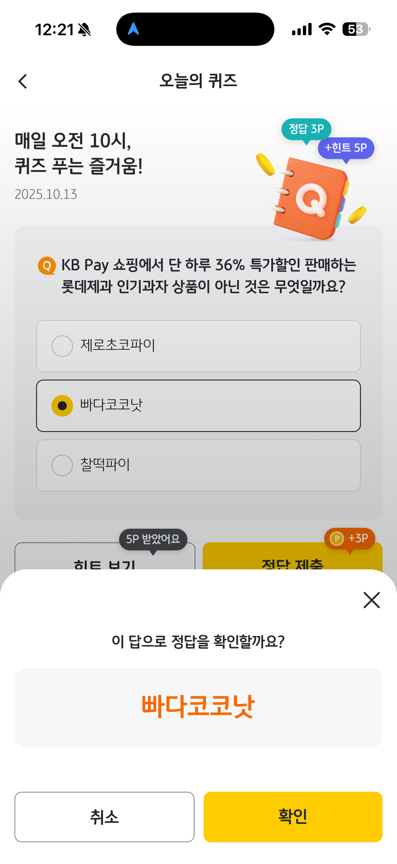 KB pay 오늘의 퀴즈 정답은 빠다코코낫 입니다