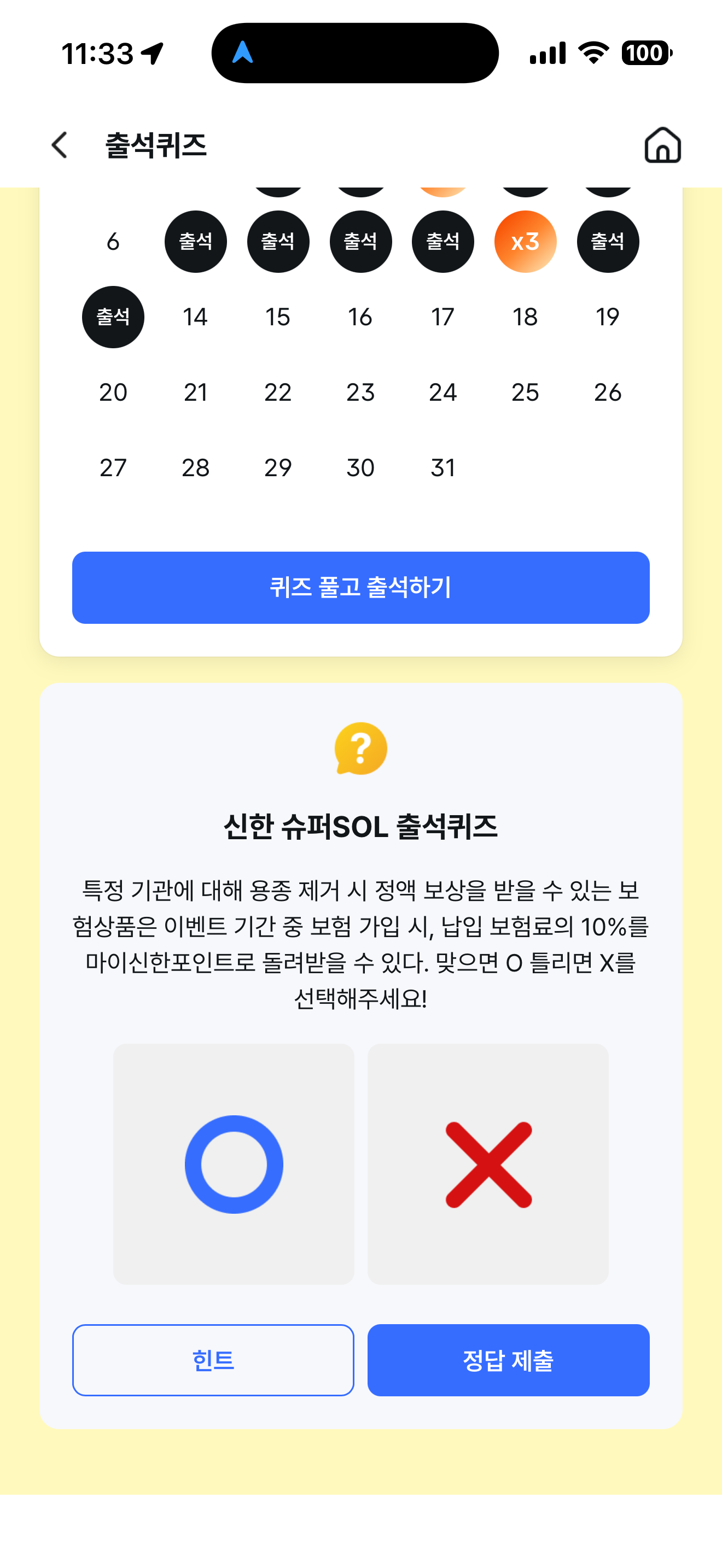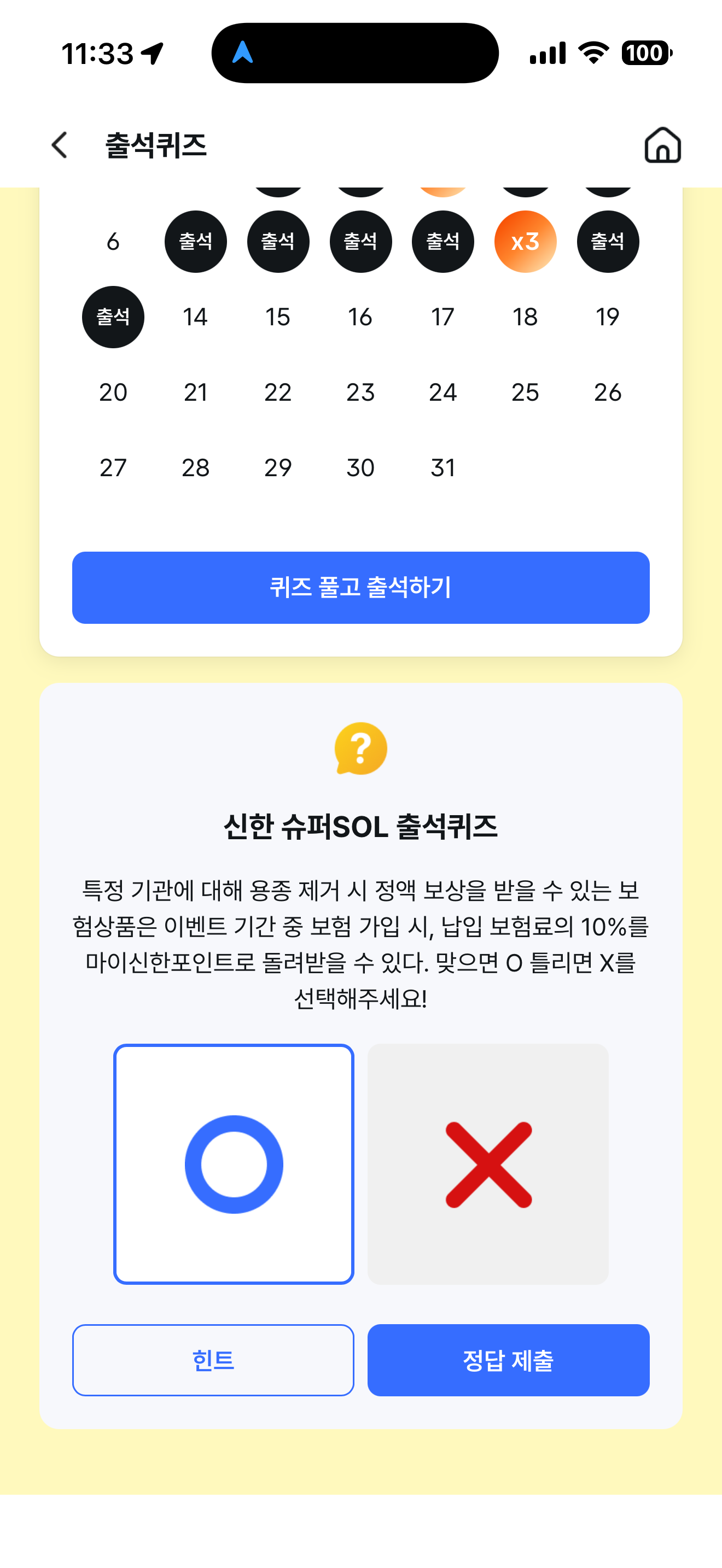 신한 슈퍼SOL 출석퀴즈 정답은 O 입니다