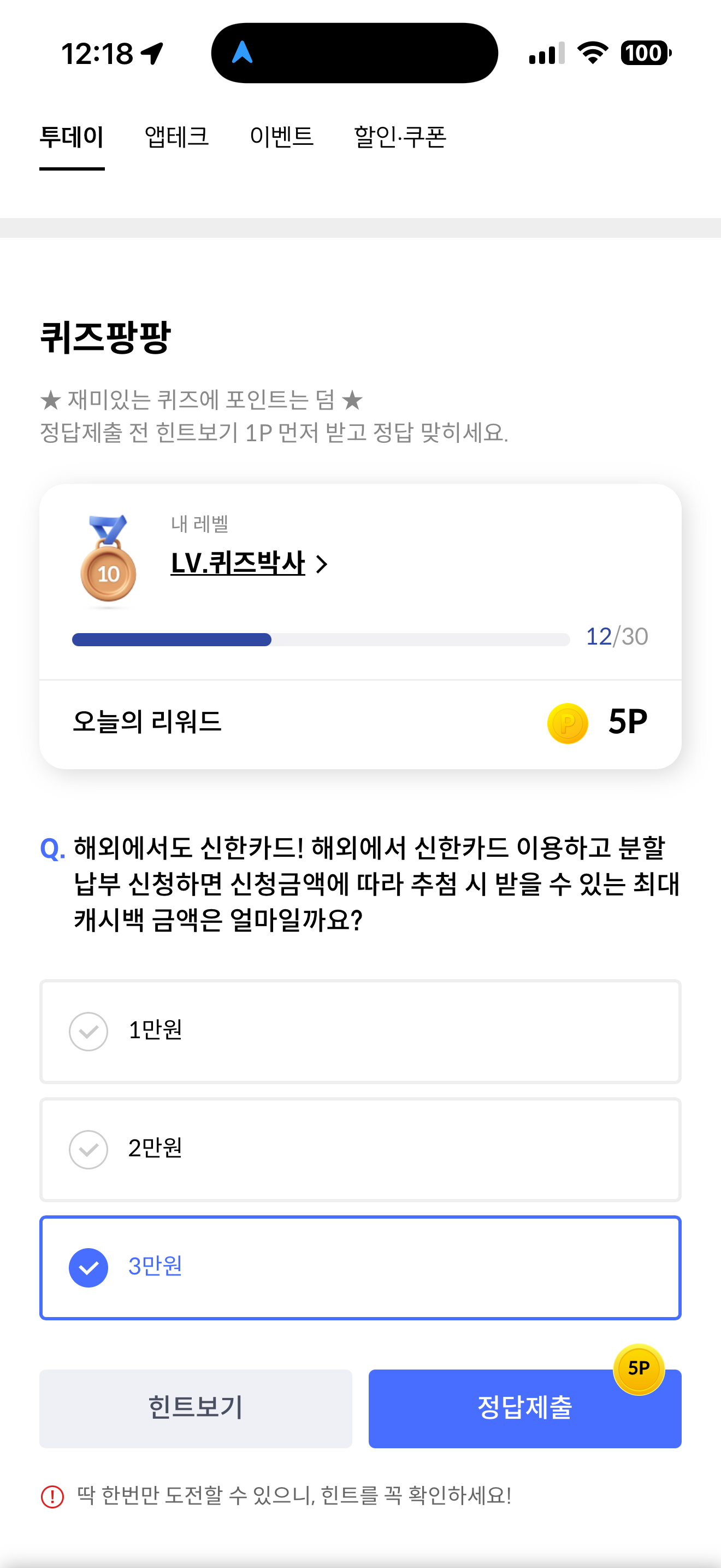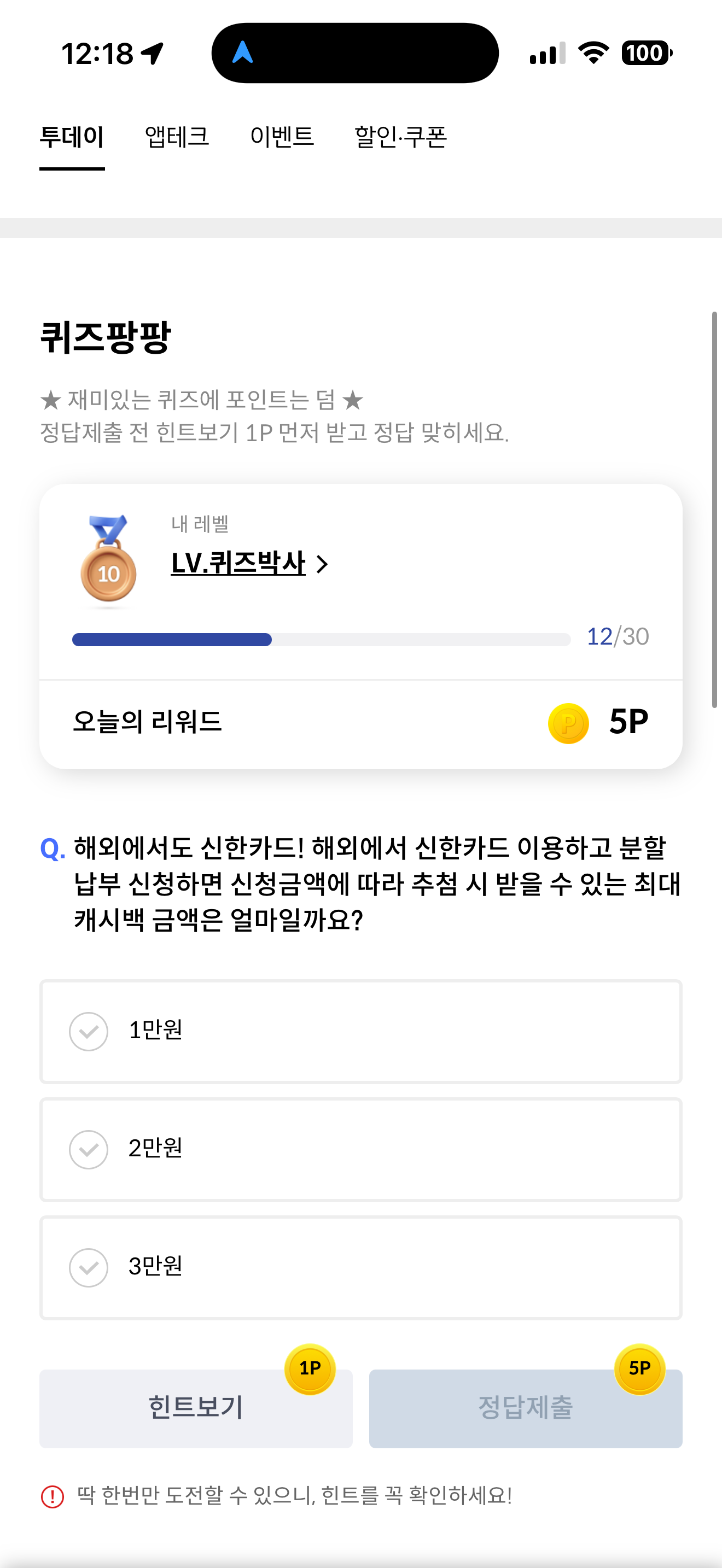 신한카드 퀴즈팡팡 정답은 3만원 입니다