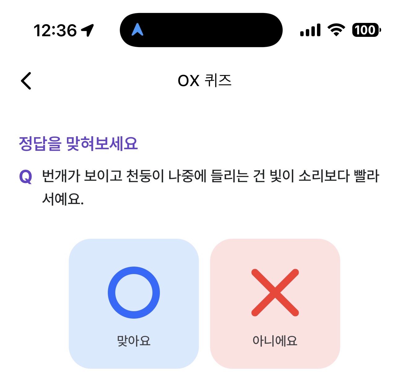 번개가 보이고 천둥이 나중에 들리는 건 빛이 소리보다 빨라서예요. O, X 퀴즈인데요. 많이들 경험한 부분이죠. 번개는 치는데 소리는 나중에 두둥 울리는거 뭔가 시간차로 느껴지는데요. 왜 그런지 상식적으로 알아 두세요