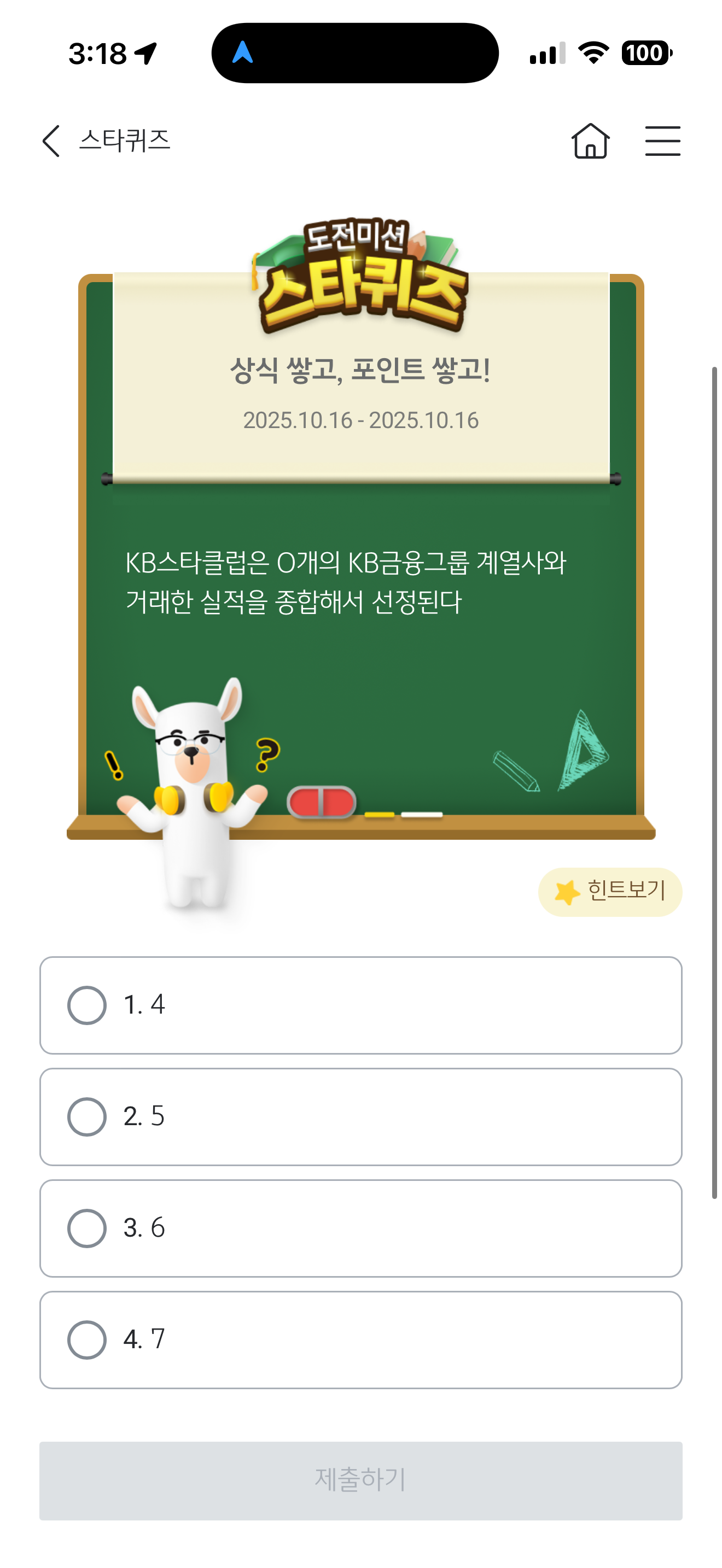 KB스타뱅킹 스타퀴즈 정답은 4. 7 입니다