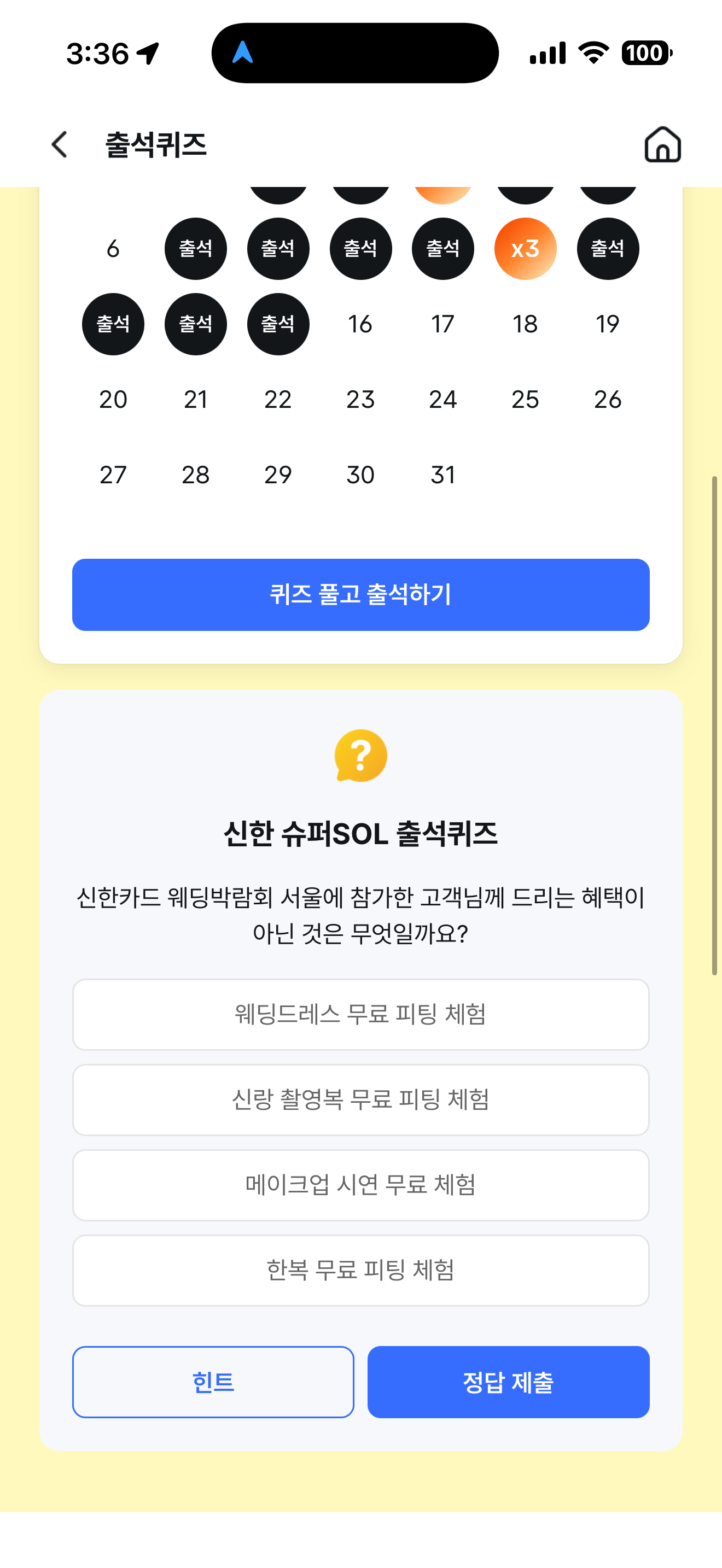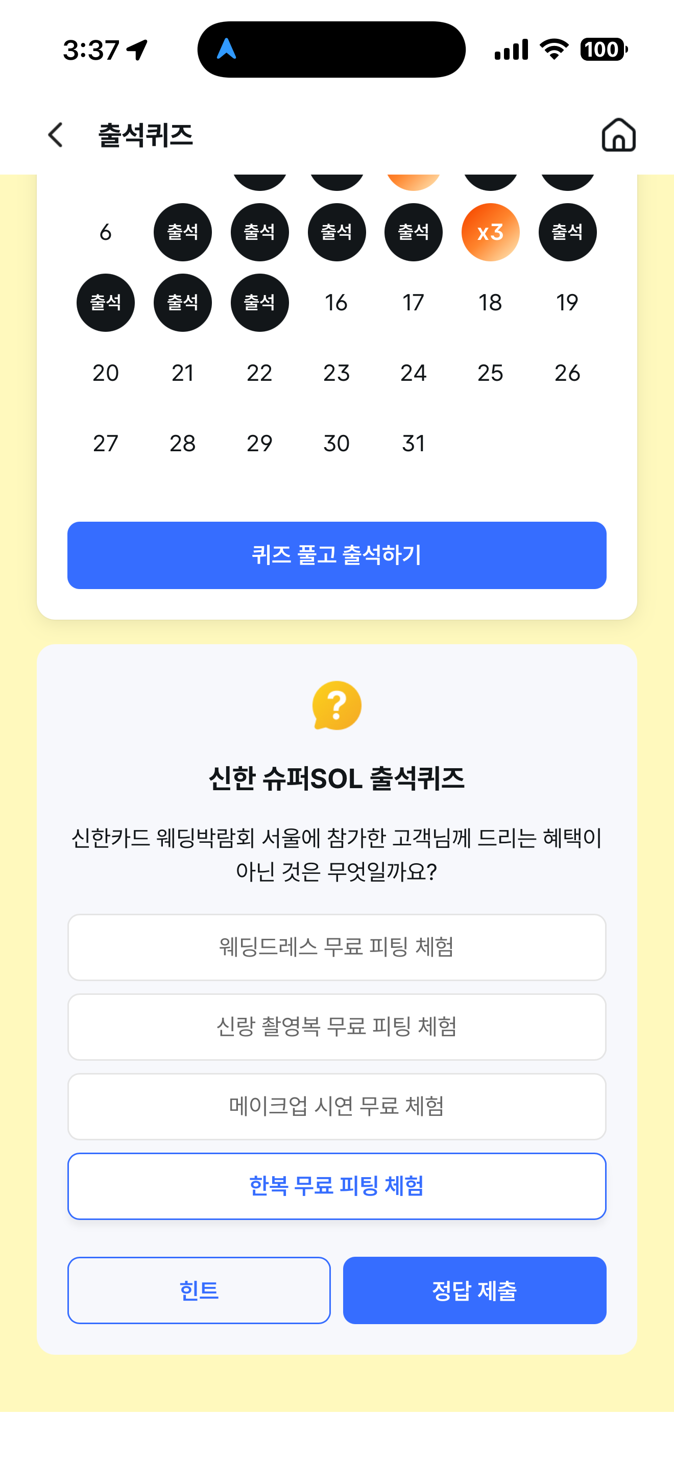 신한 슈퍼SOL 출석퀴즈 한복 무료 피팅 체험 입니다
