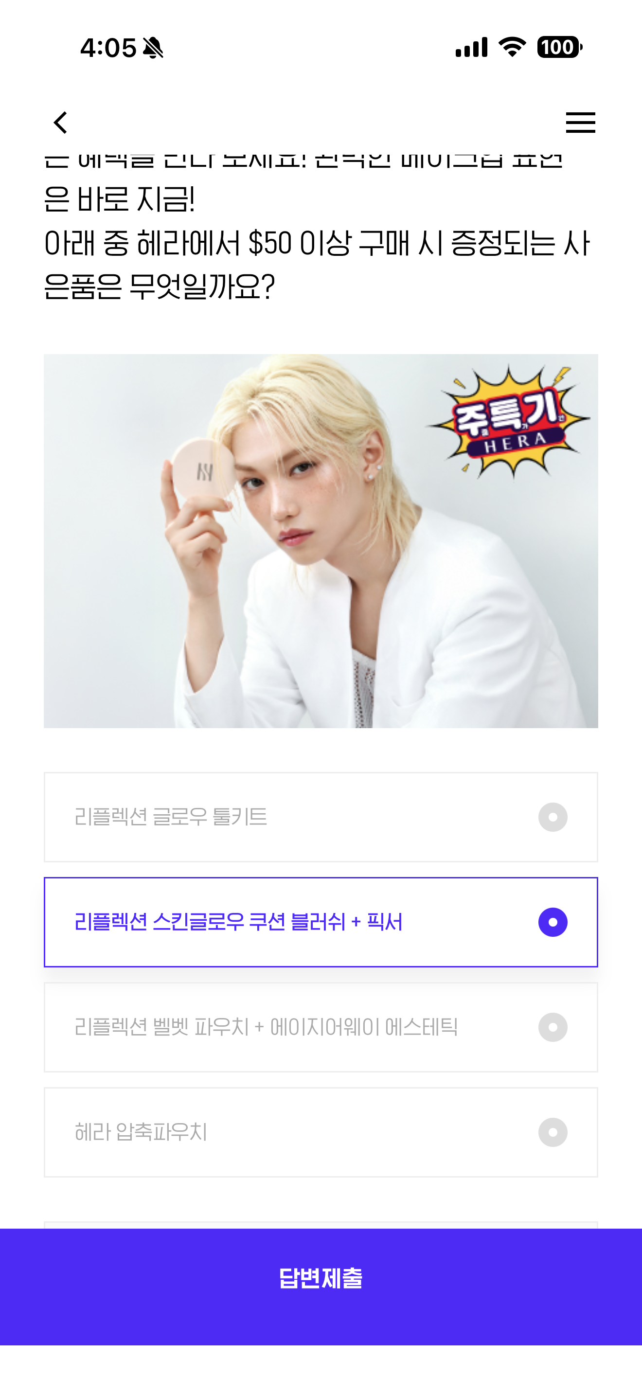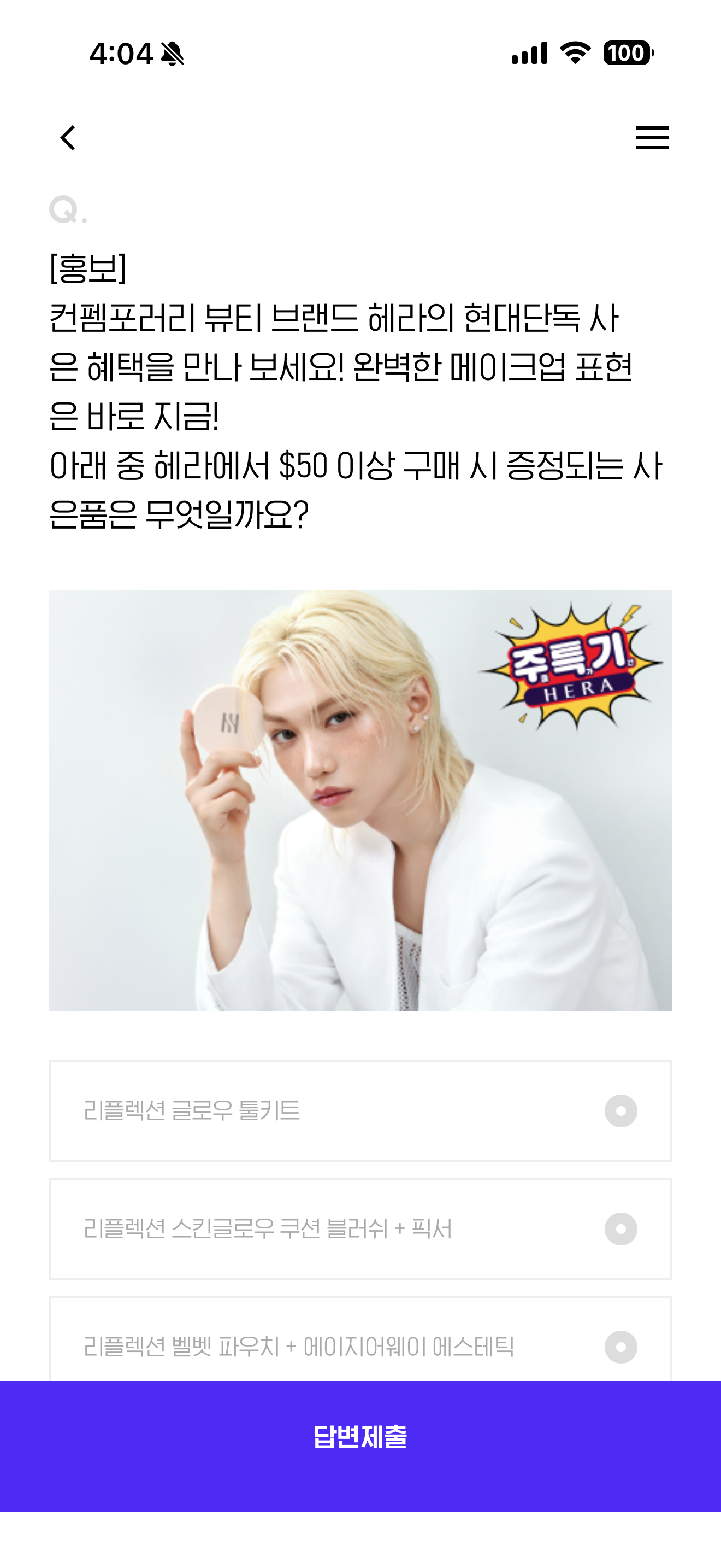 컨펨포러리 뷰티 브랜드 헤라의 현대단독 사은 혜택을 만나 보세요! 완벽한 메이크업 표현은 바로 지금! 아래 중 헤라에서 $50 이상 구매 시 증정되는 사은품은 무엇일까요? 보기는 1. 리플렉션 글로우 툴키트 2. 리플렉션 스킨글로우 쿠션 블러쉬 + 픽서 3. 리플렉션 벨벳 파우치 + 에이지어웨이 에스테틱 입니다