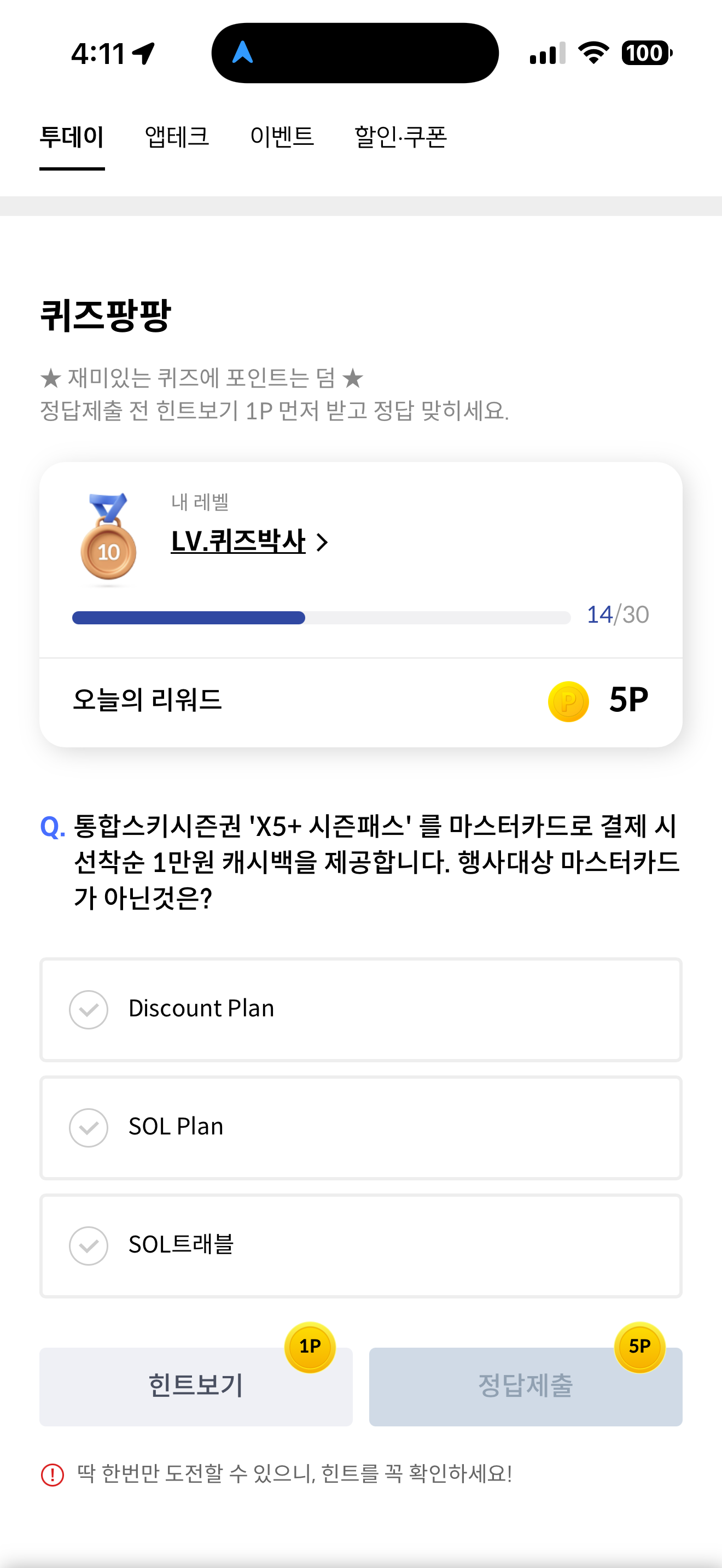 통합스키시즌권 'X5+ 시즌패스' 를 마스터카드로 결제 시 선착순 1만원 캐시백을 제공합니다. 행사대상 마스터카드가 아닌것은? 보기는 1. Discount Plan 2. SOL Plan 3. SOL트래블 입니다