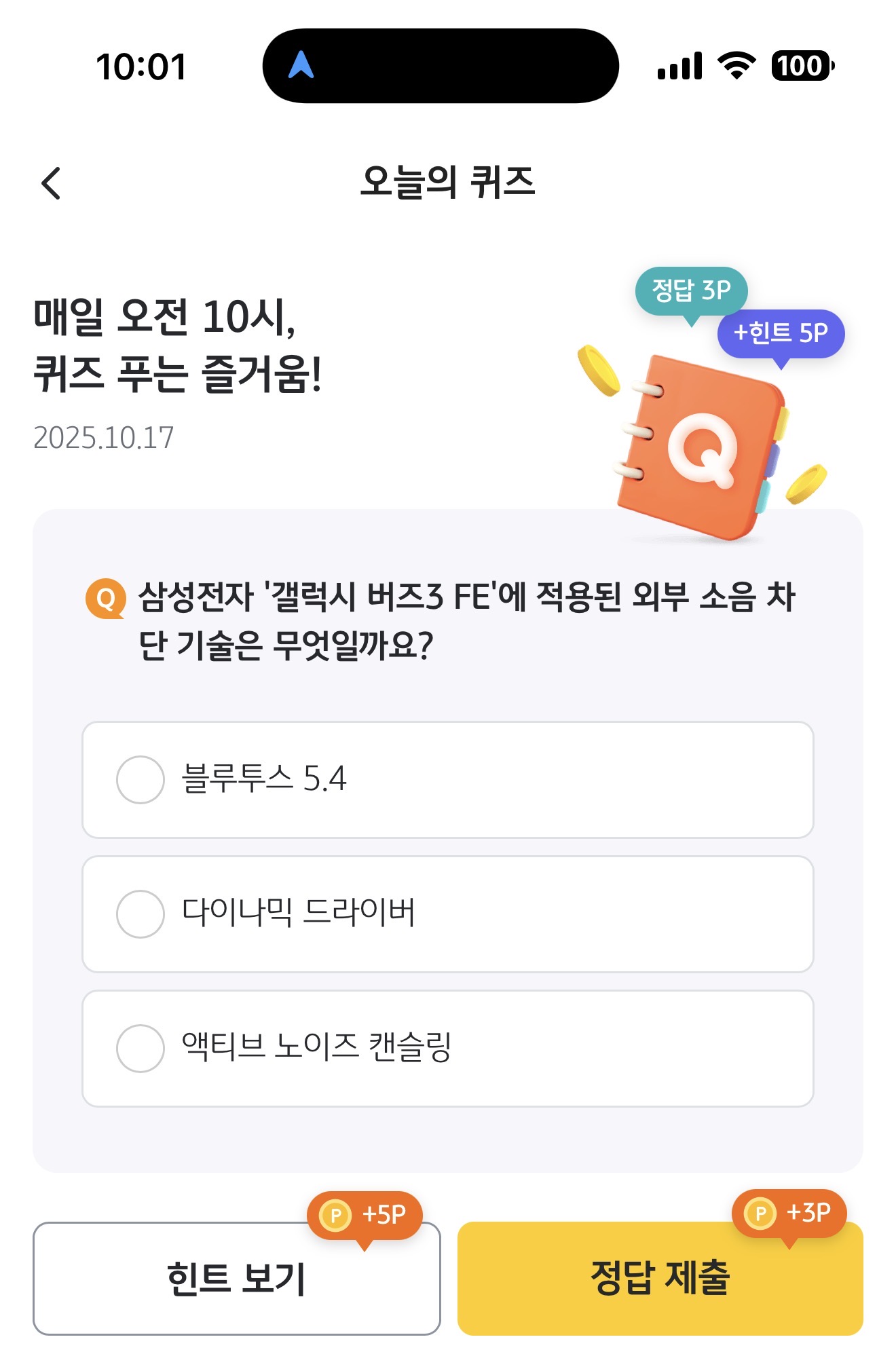 삼성전자 '갤럭시 버즈3 FE'에 적용된 외부 소음 차단 기술은 무엇일까요? 보기는 1. 블루투스 5.4 2. 다이나믹 드라이버 3. 액티브 노이즈 캔슬링 입니다. 갤럭시 버즈3 FE는 외부 소음 차단 기술이 들어가 있습니다. 요즘엔 거의 필수로 자리 잡은 기능이죠