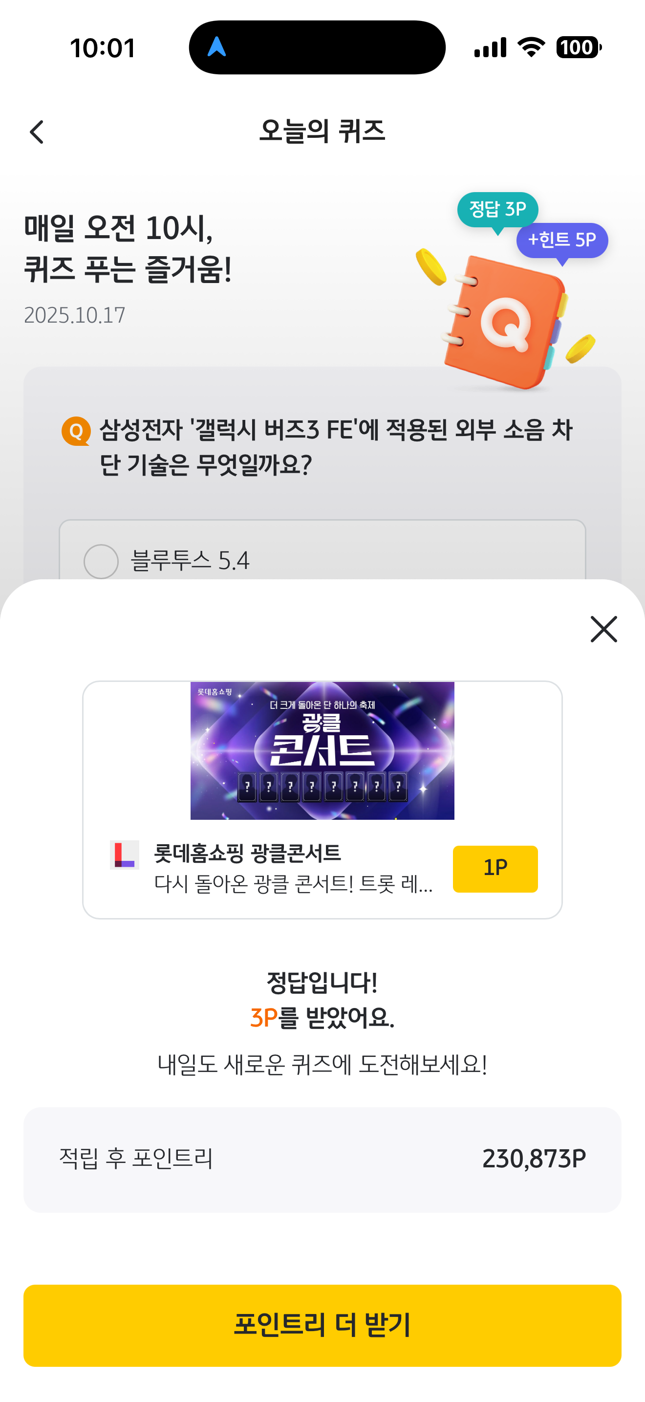 KB pay 오늘의 퀴즈 정답은 액티브 노이즈 캔슬링 입니다