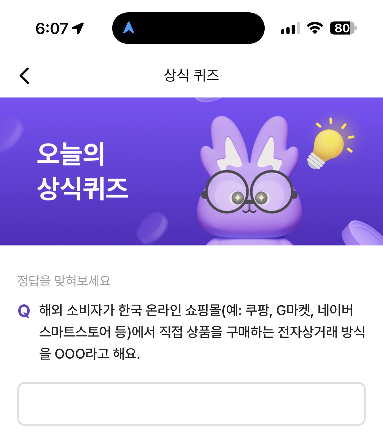 비트버니 오늘의 퀴즈 10월 19일 ㅇㅈㄱ 정답(해외 소비자가 한국 온라인 쇼핑몰(예: 쿠팡, G마켓, 네이버 스마트스토어 등)에서 직접 상품을 구매하는 전자상거래 방식을 OOO라고 해요)