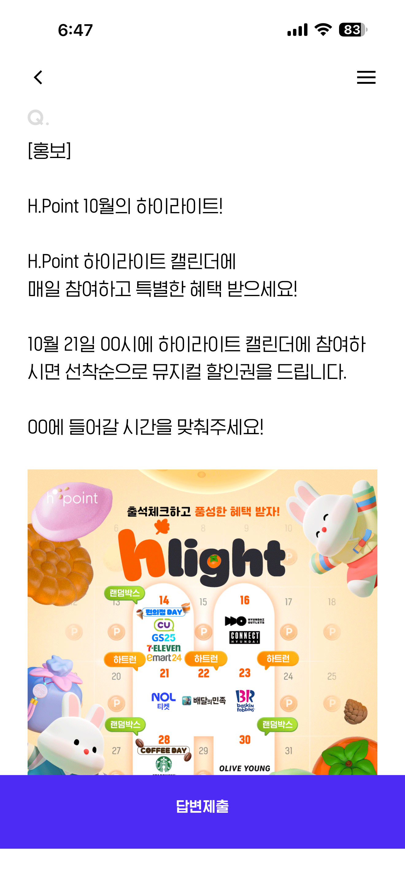 H.Point 10월의 하이라이트! H.Point 하이라이트 캘린더에 매일 참여하고 특별한 혜택 받으세요! 10월 21일 00시에 하이라이트 캘린더에 참여하시면 선착순으로 뮤지컬 할인권을 드립니다. OO에 들어갈 시간을 맞춰주세요!