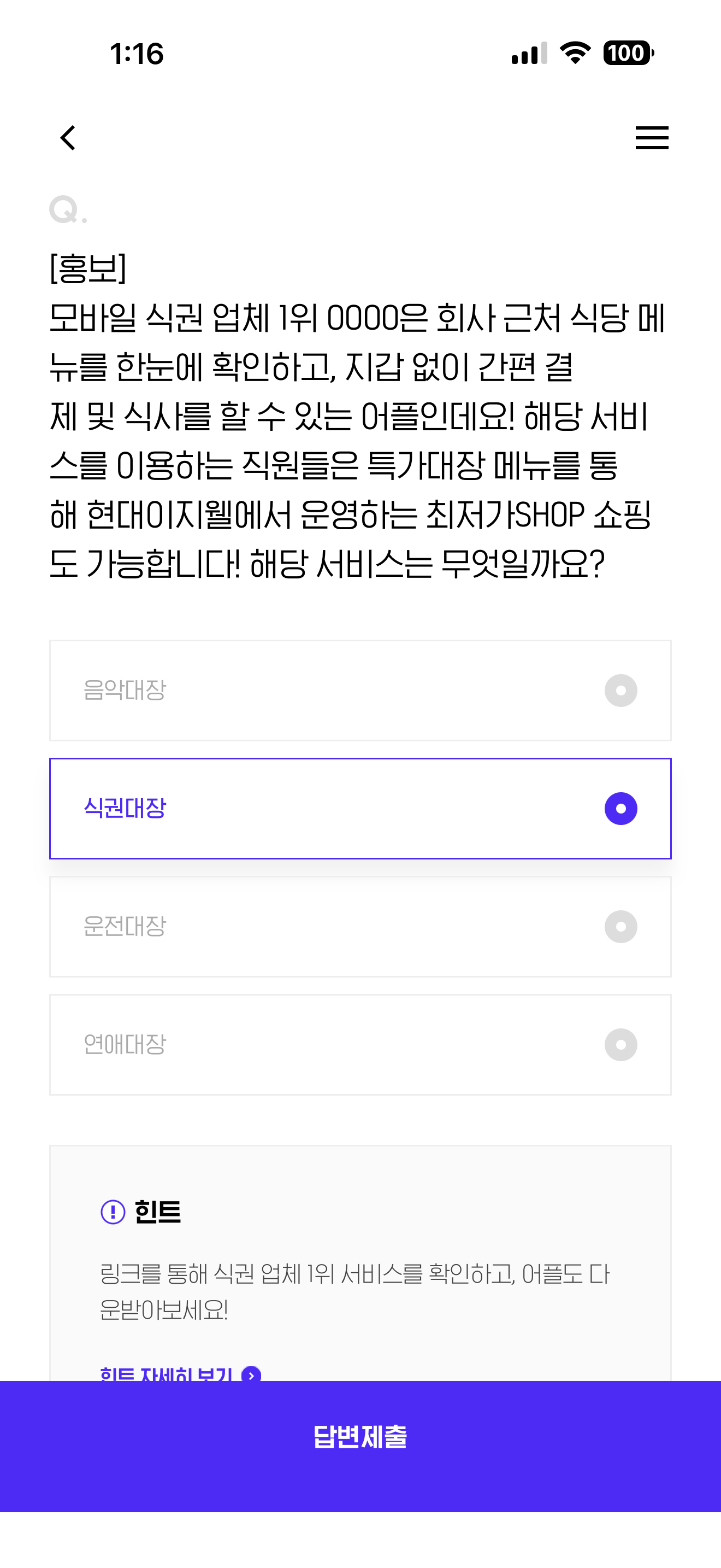 H포인트 퀴즈 10월 20일 정답(모바일 식권 업체 1위 OOOO은 회사 근처 식당 메뉴를 한눈에 확인하고, 지갑 없이 간편 결제 및 식사를 할 수 있는 어플인데요! 해당 서비스를 이용하는 직원들은 특가대장 메뉴를 통해 현대이지웰에서 운영하는 최저가SHOP 쇼핑도 가능합니다! 해당 서비스는 무엇일까요?)