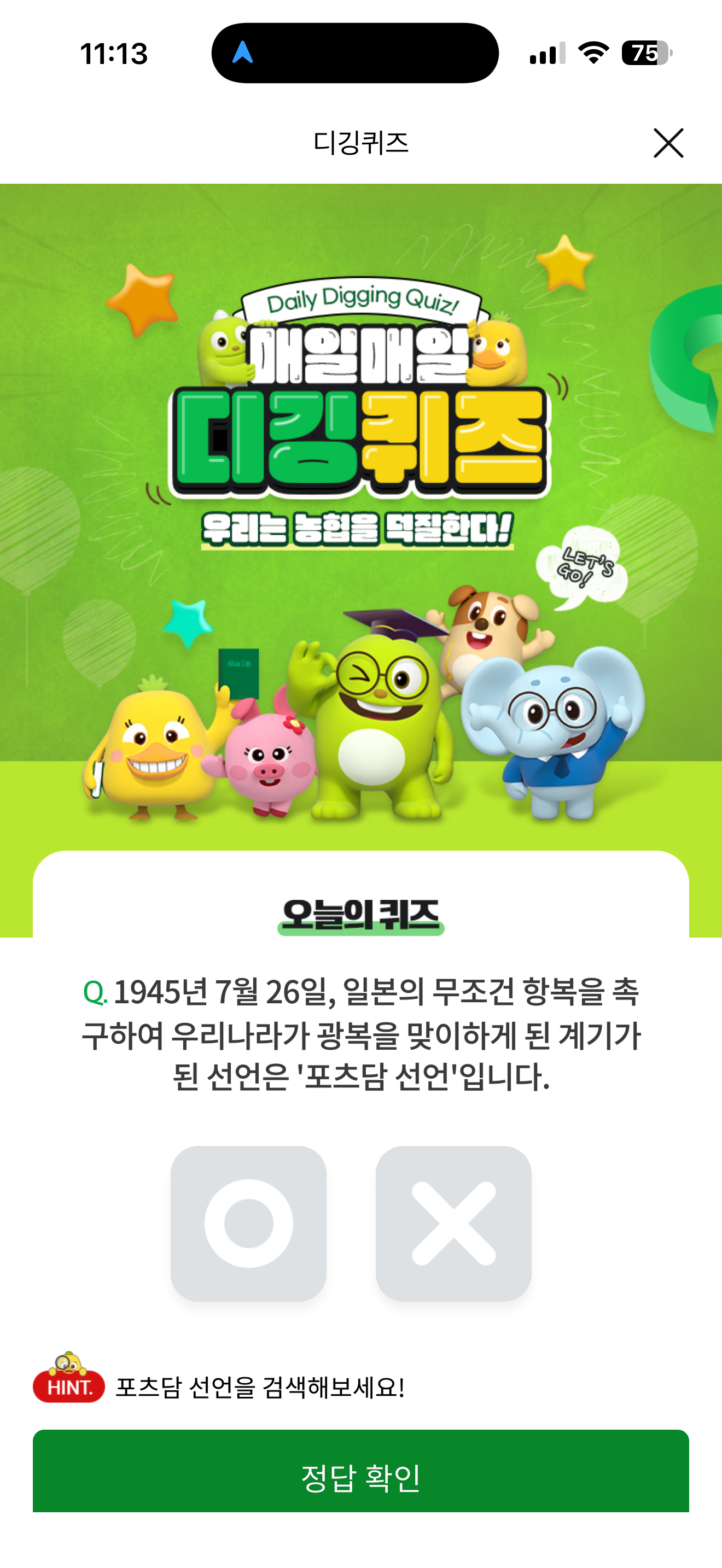 1945년 7월 26일, 일본의 무조건 항복을 촉구하여 우리나라가 광복을 맞이하게 된 계기가 된 선언은 '포츠담 선언'입니다 O, X 퀴즈인데요. 일본의 무조건 항복을 촉구하여 우리나라가 광곱ㄱ을 맞이하게 된 계기가 있습니다
