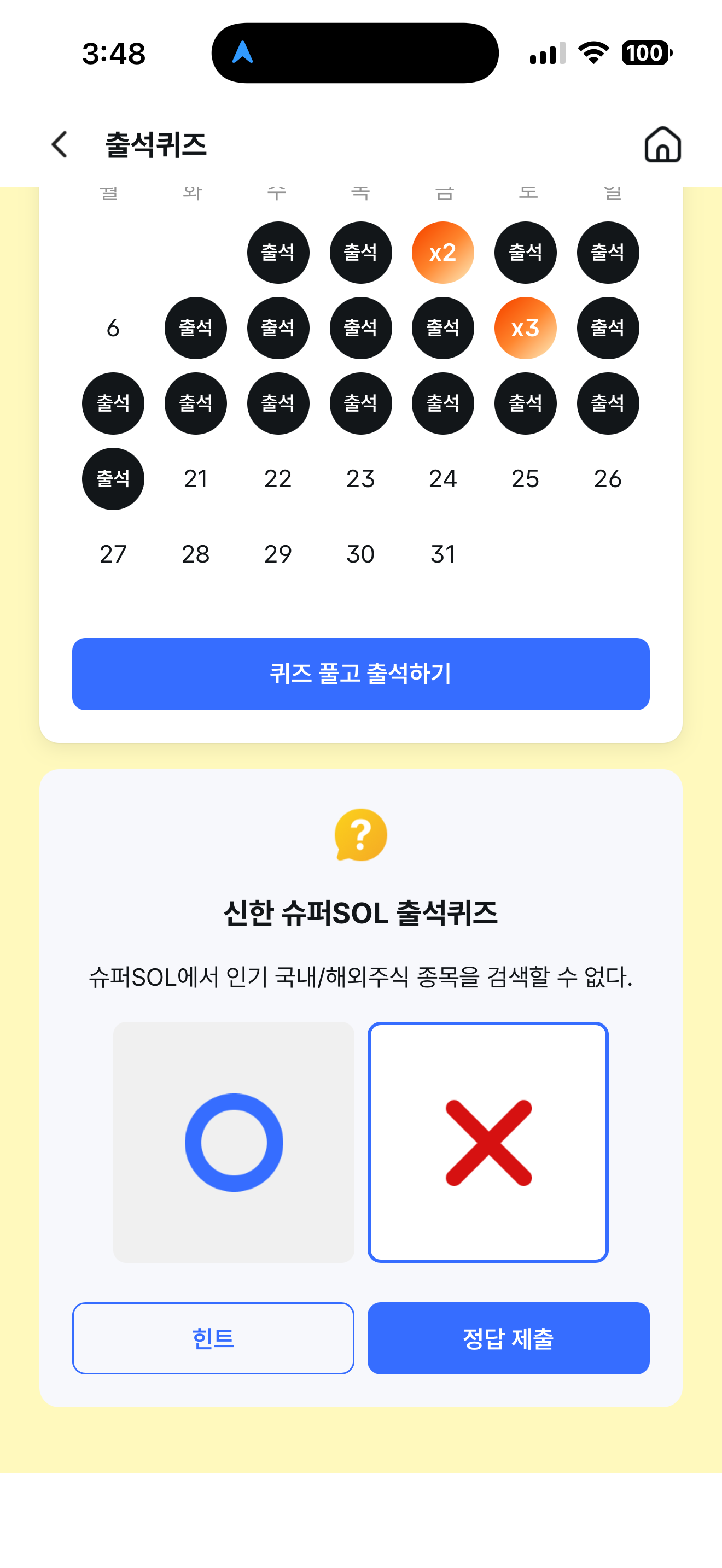신한 슈퍼SOL 출석퀴즈 정답은 X 입니다