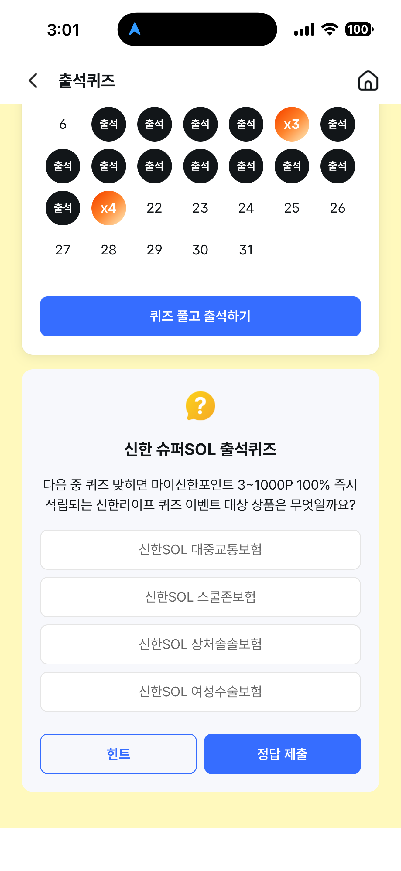 신한 슈퍼SOL 출석퀴즈 정답은 신한SOL 대중교통보험 입니다