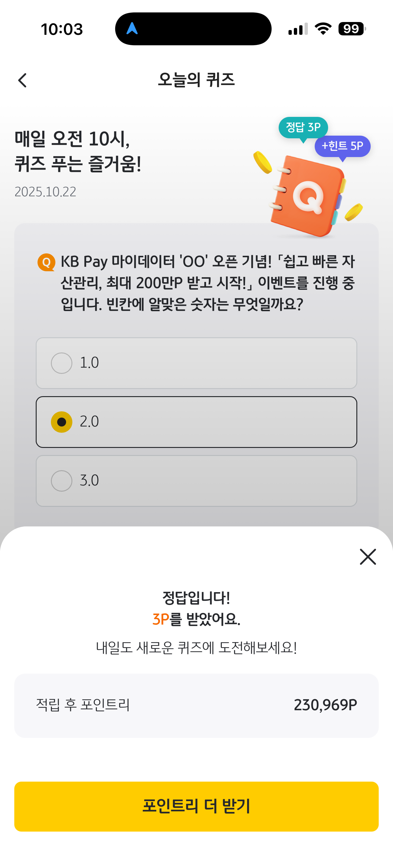 KB Pay 오늘의 퀴즈 정답은 2.0 입니다