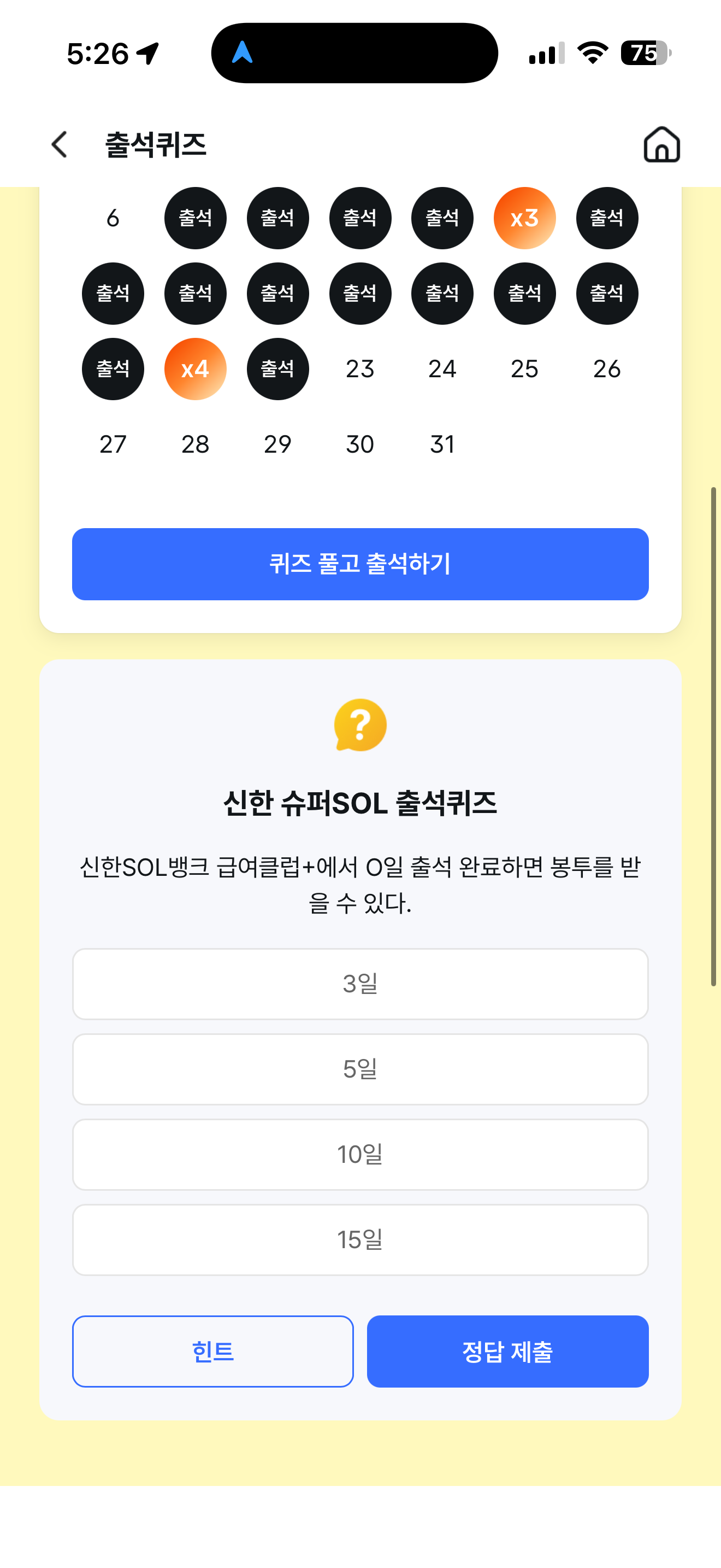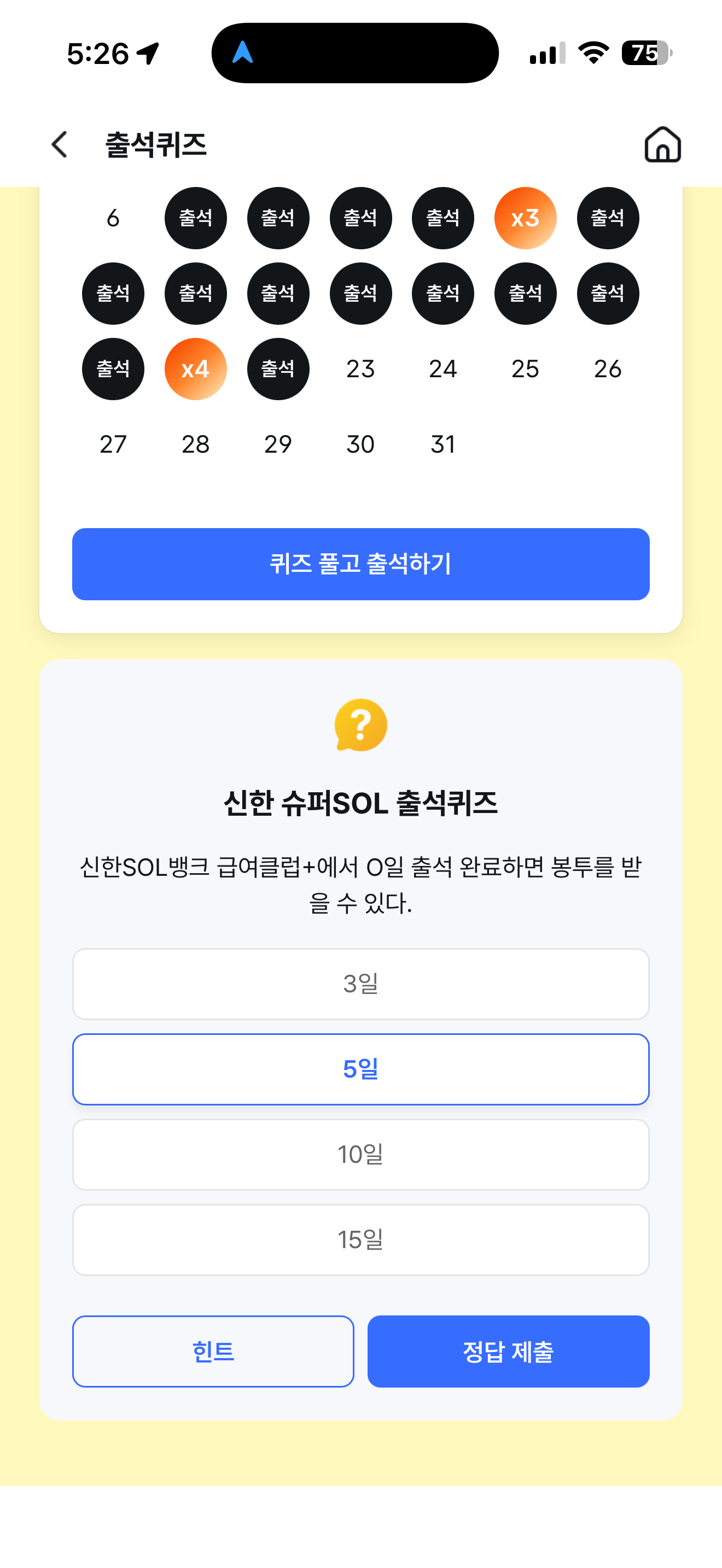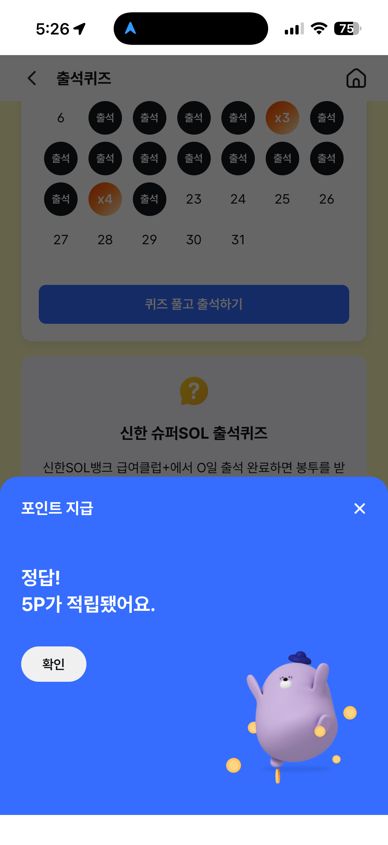 신한 슈퍼SOL 출석퀴즈 정답은 5일 입니다