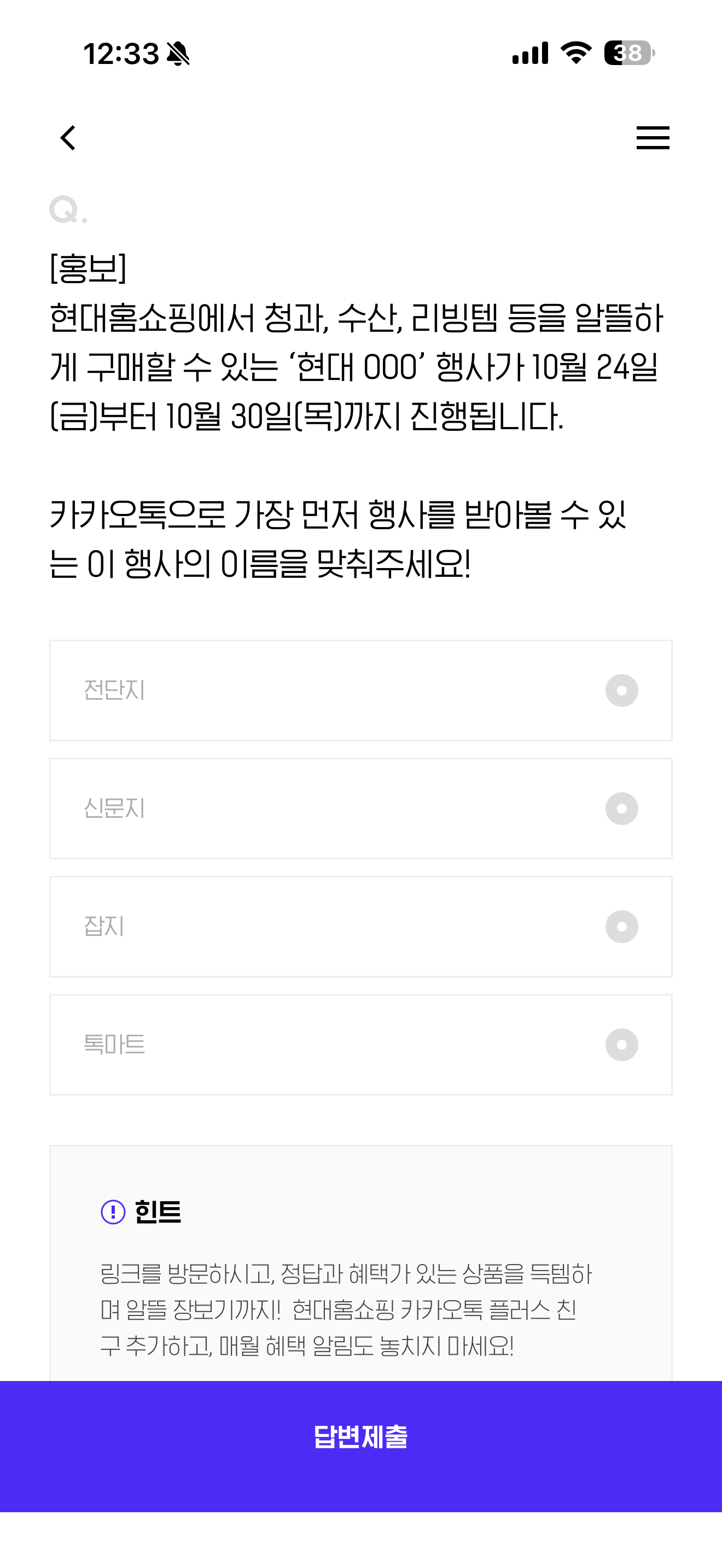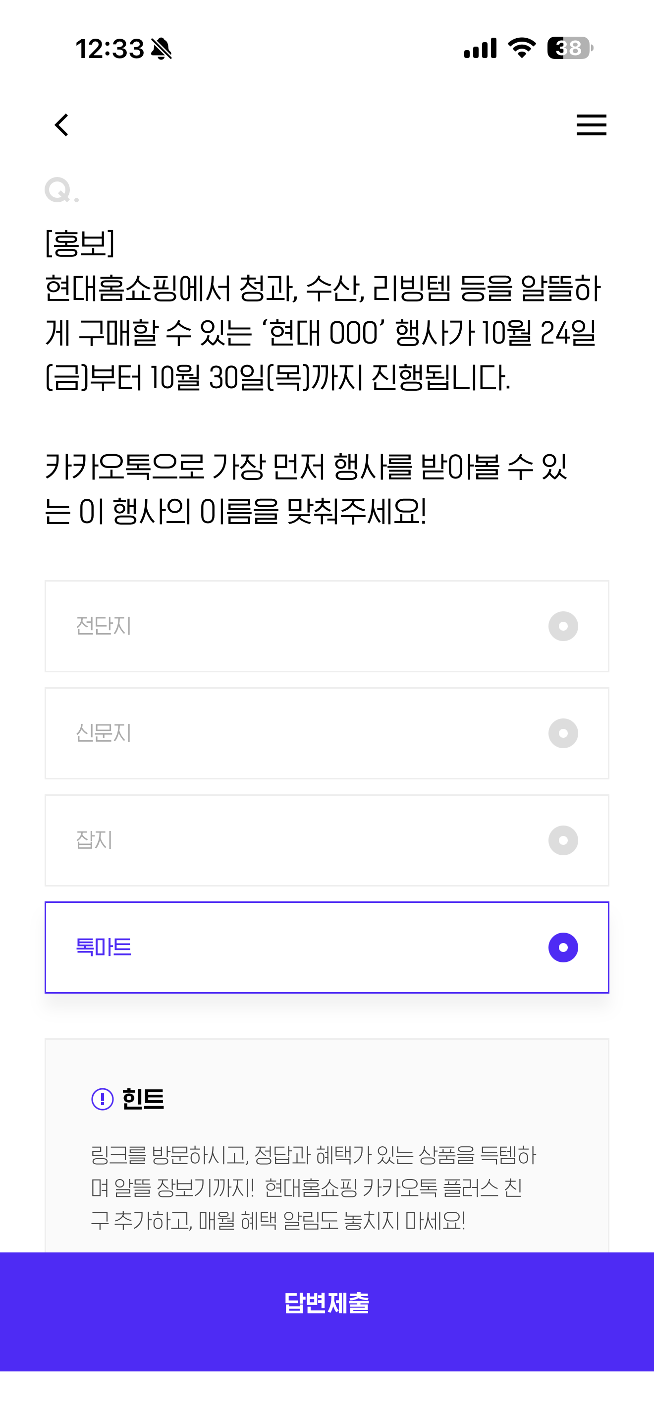 현대홈쇼핑에서 청과, 수산, 리빙템 등을 알뜰하게 구매할 수 있는 '현대 000' 행사가 10월 24일(금)부터 10월 30일(목)까지 진행됩니다. 카카오톡으로 가장 먼저 행사를 받아볼 수 있는 이 행사의 이름을 맞춰주세요! 보기는 1. 전단지 2. 신문지 3. 잡지 4. 톡마트 입니다