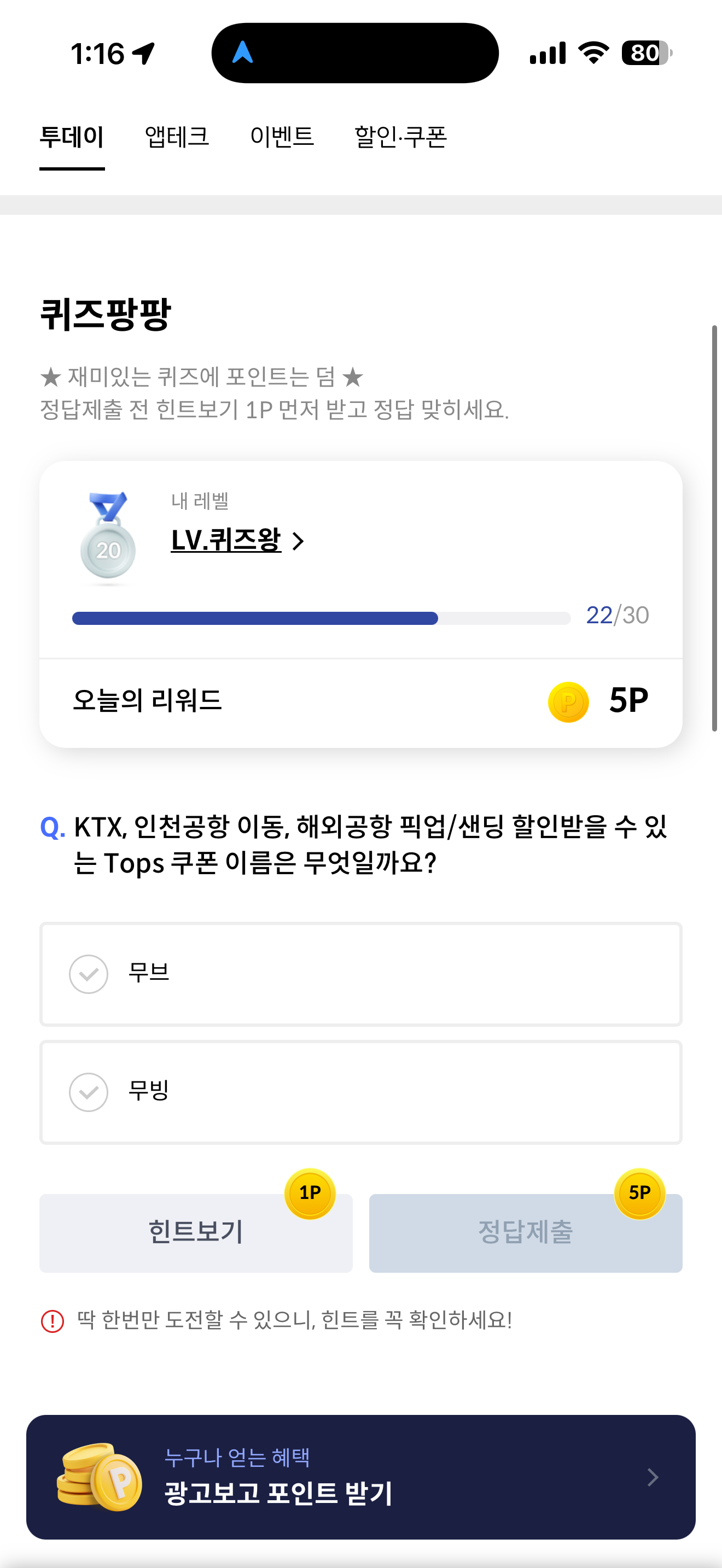 KTX, 인천공항 이동, 해외공항 픽업/샌딩 할인받을 수 있는 Tops 쿠폰 이름은 무엇일까요? 보기는 1. 무브 2. 무빙 입니다. KTX, 인천공항 등 해외여행시에 활용하기 좋은 쿠폰이니 잘 참고해 두세요