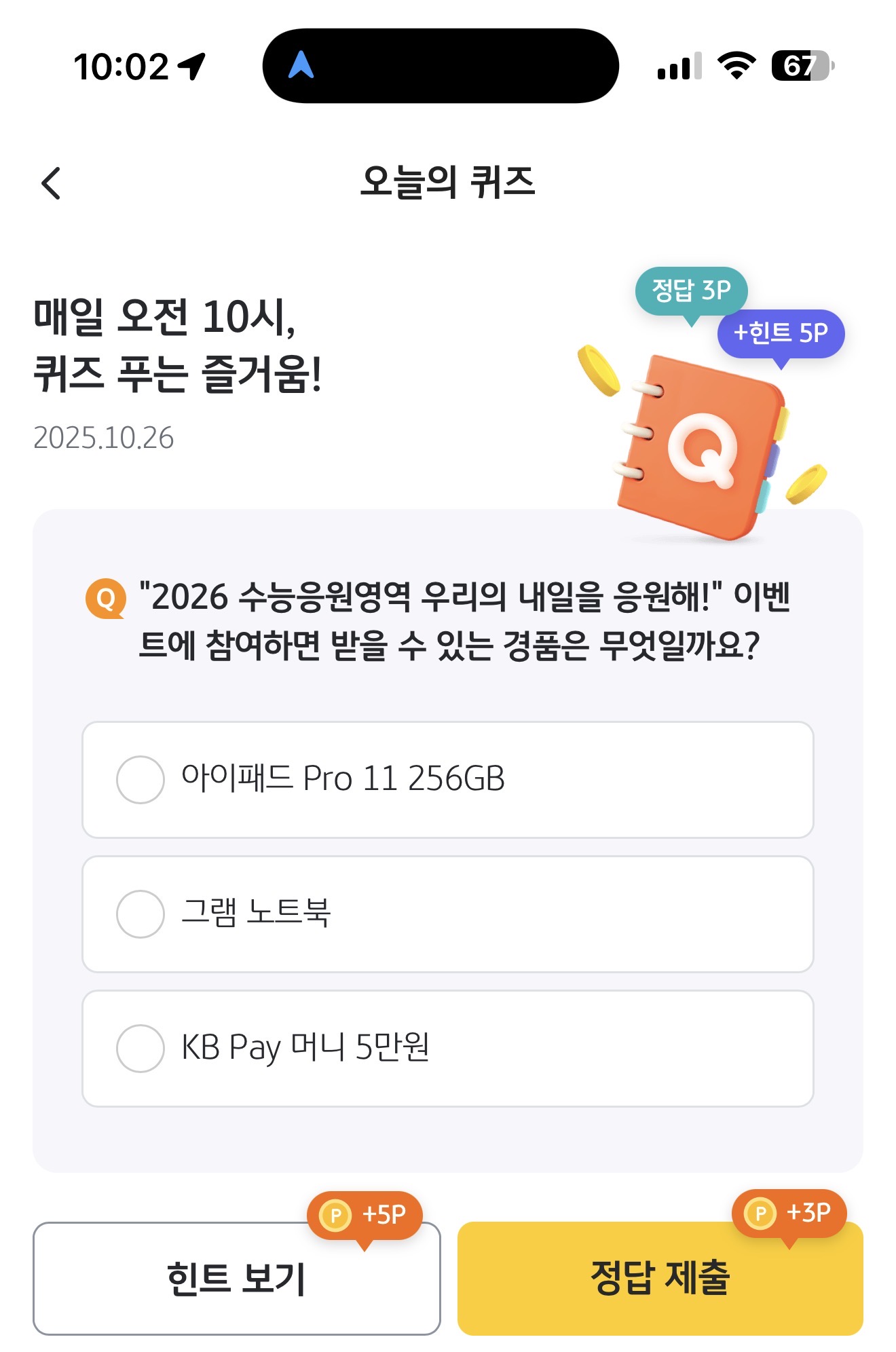 KB Pay 오늘의 퀴즈 10월 26일 문제입니다