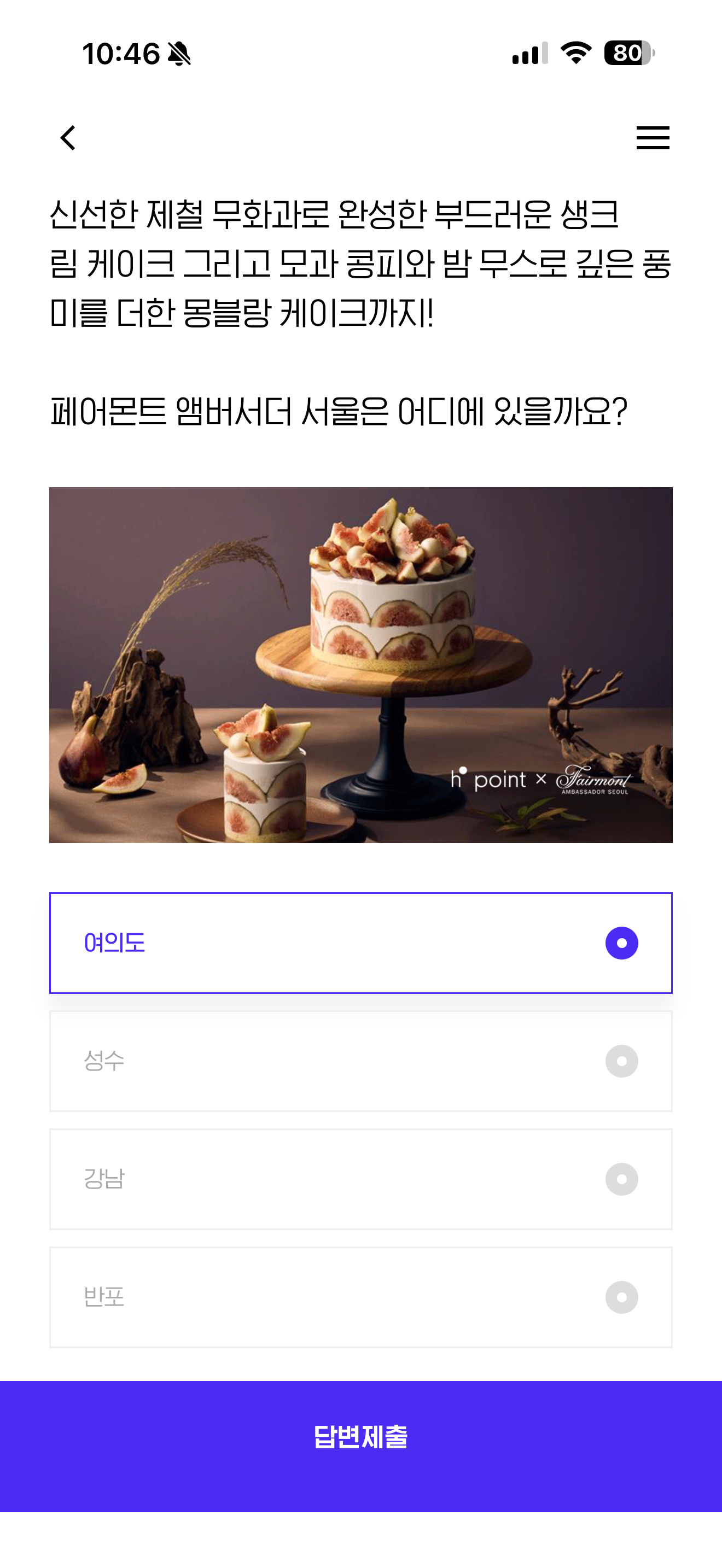 H포인트 퀴즈 10월 26일 정답(페어몬트 앰버서더 서울 더 아트리움 라운지에서 H.Point 회원 대상 시즌 한정 디저트 10% 할인 혜택을 받으세요! 신선한 제철 무화과로 완성한 부드러운 생크림 케이크 그리고 모과 콩피와 밤 무스로 깊은 풍미를 더한 몽블랑 케이크까지!)