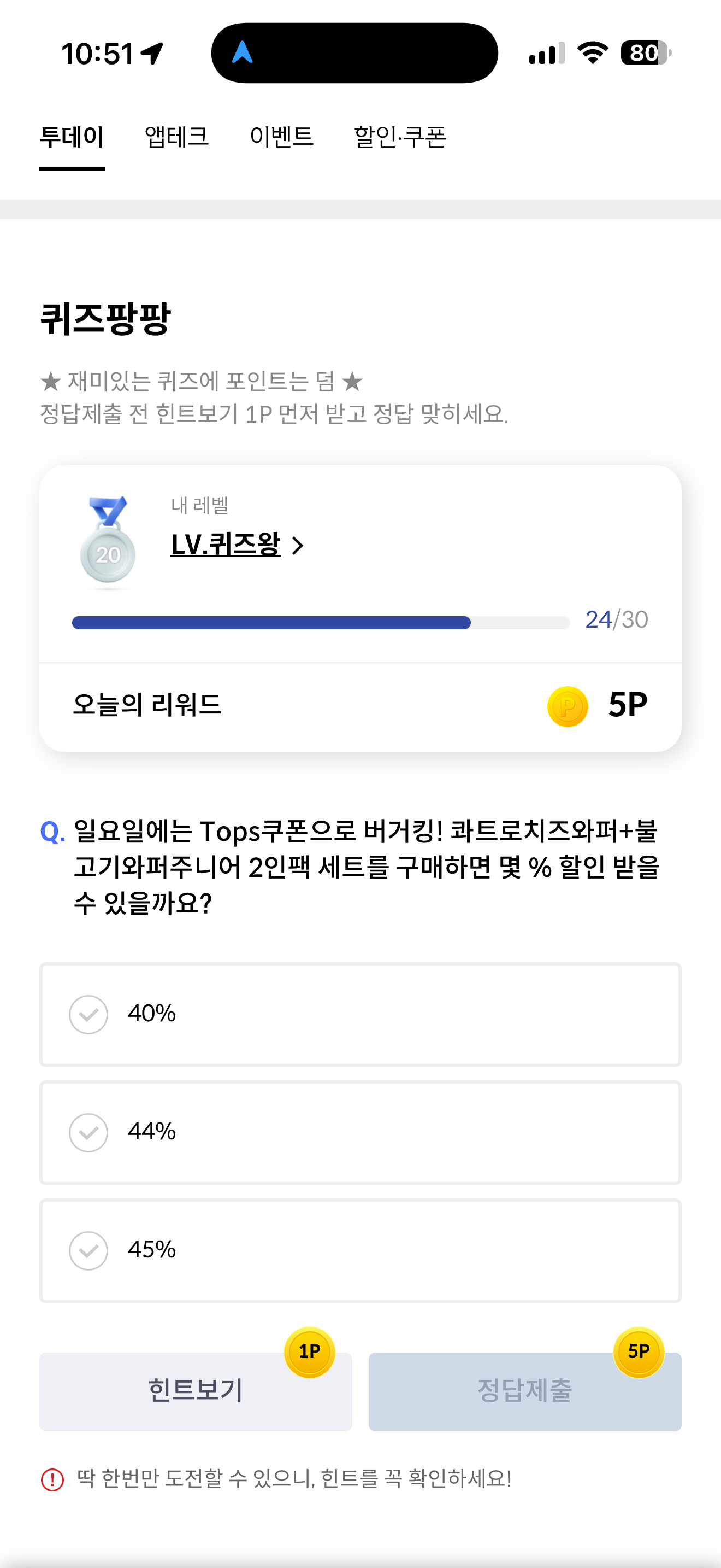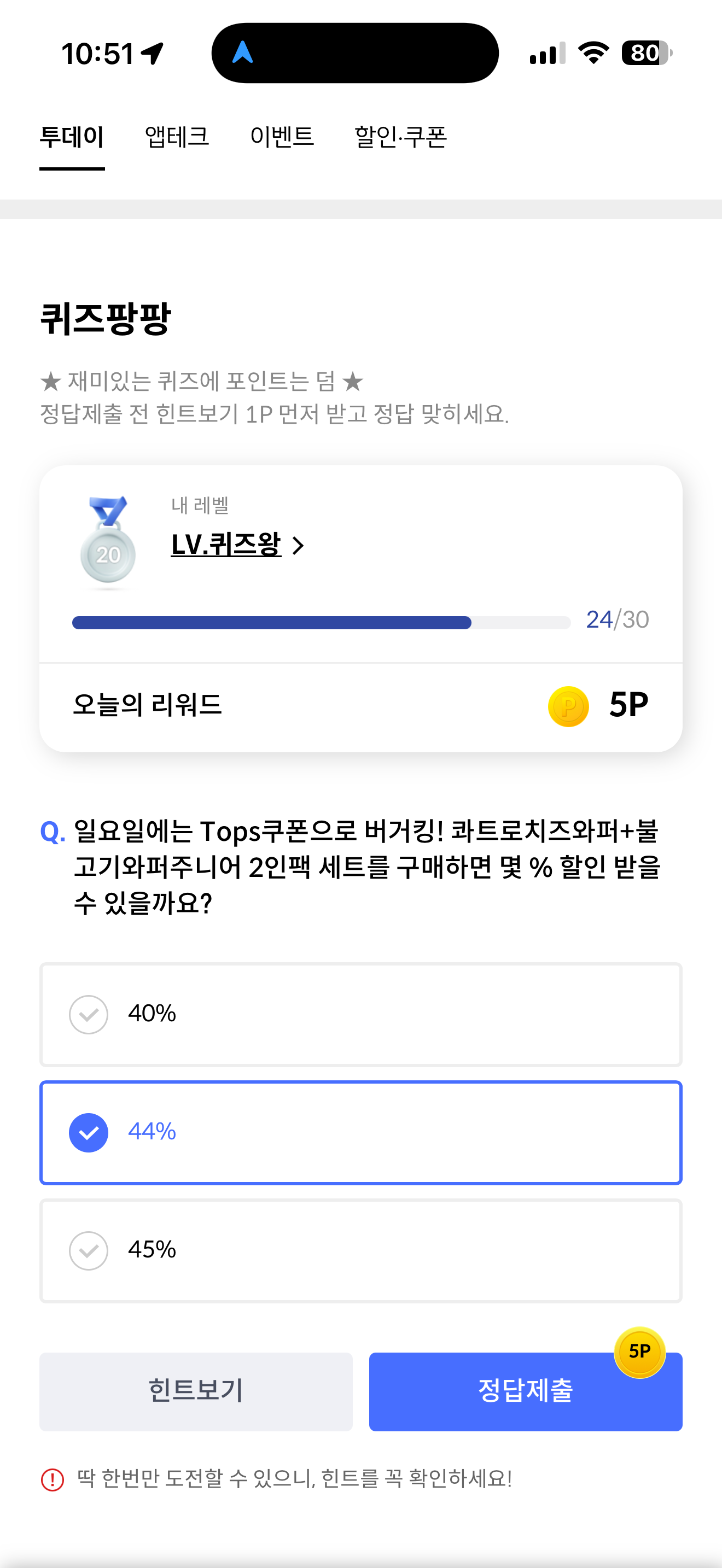 신한카드 퀴즈팡팡 정답은 44% 입니다