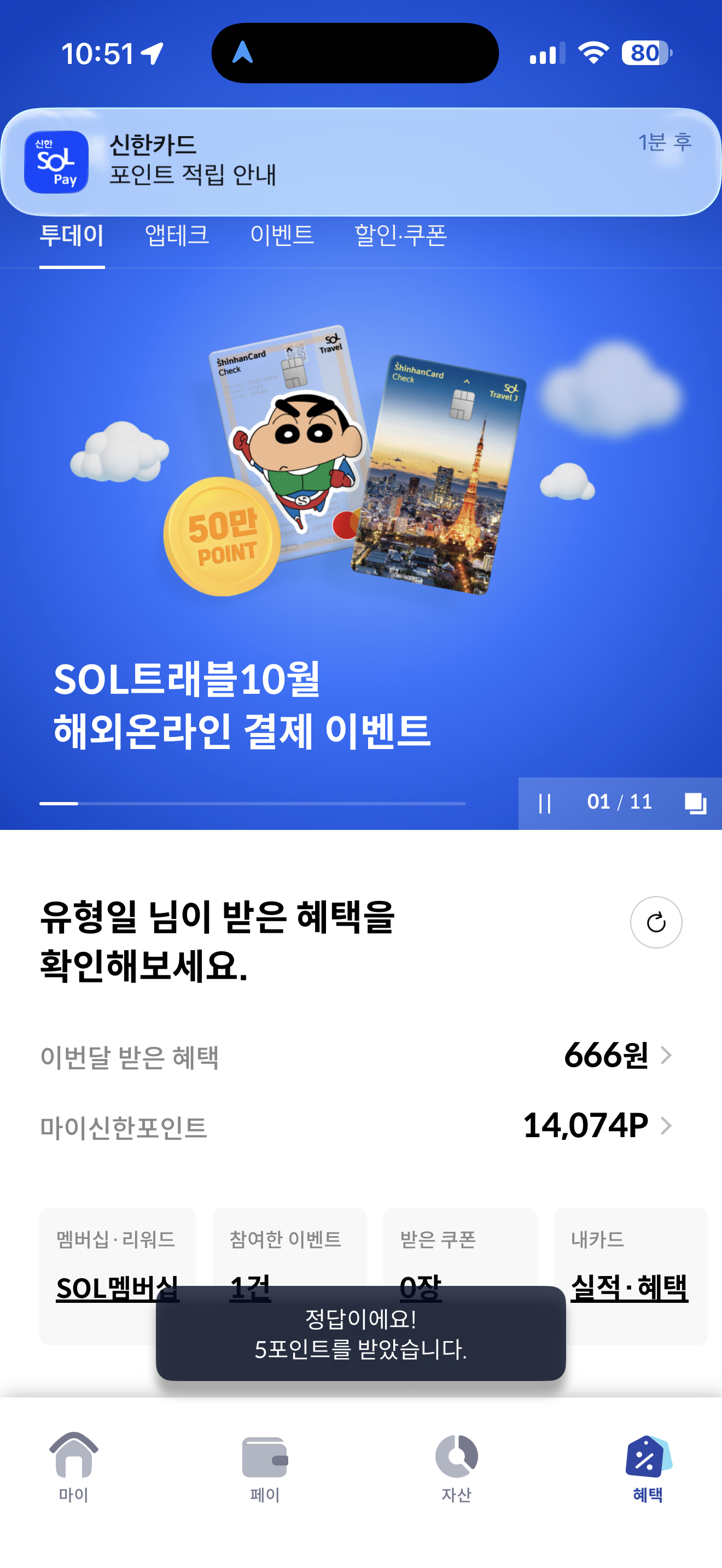 신한카드 퀴즈팡팡 10월 26일 문제입니다