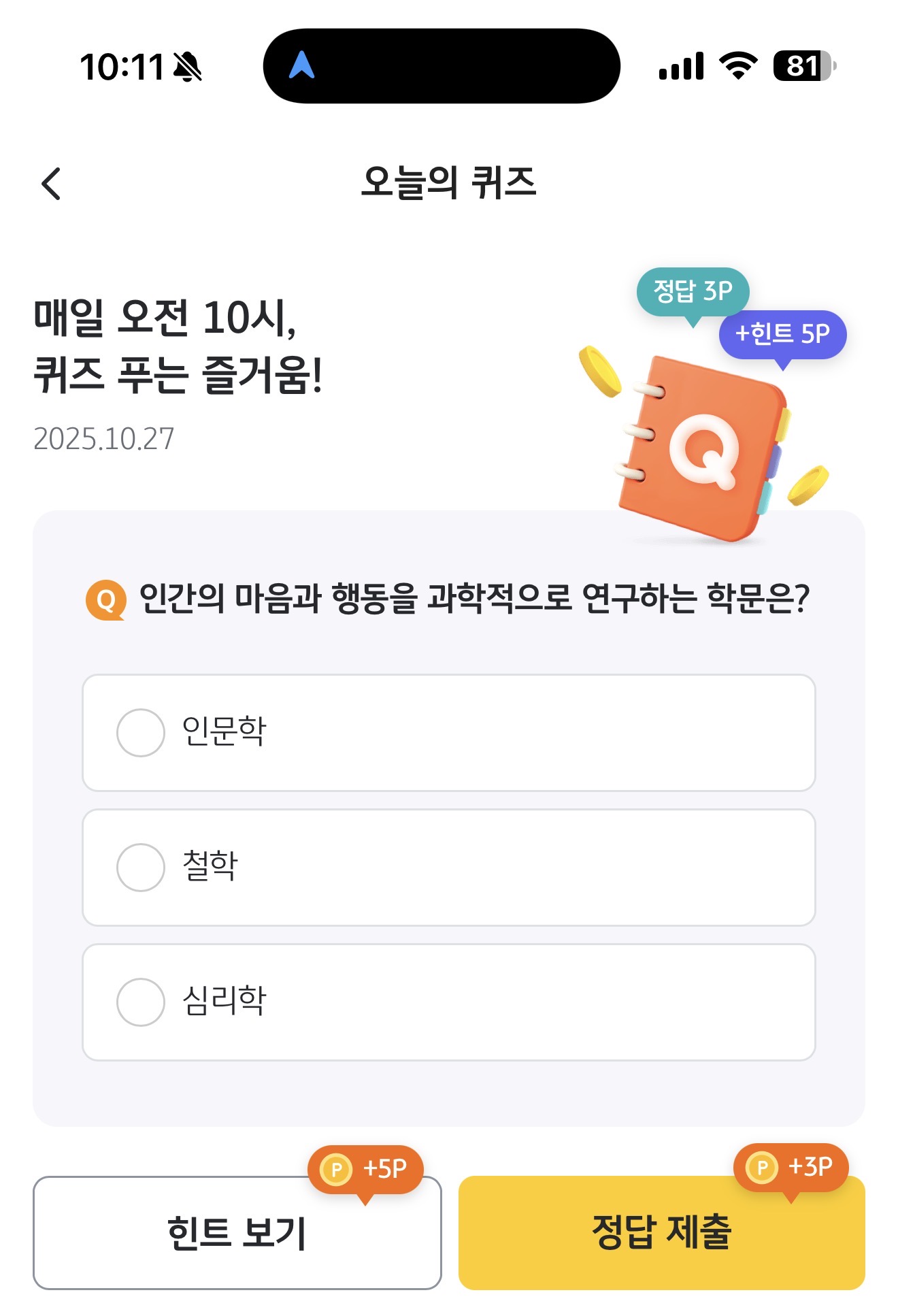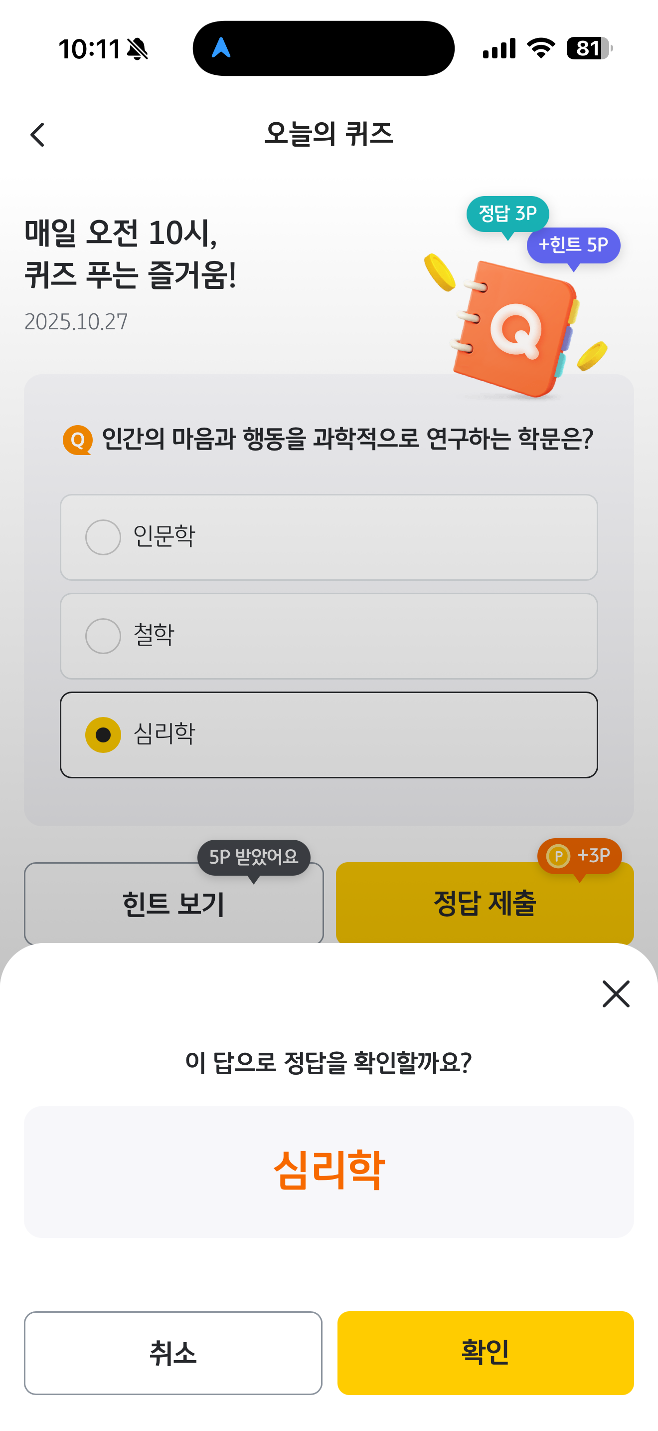 KB Pay 오늘의 퀴즈 정답은 심리학 입니다