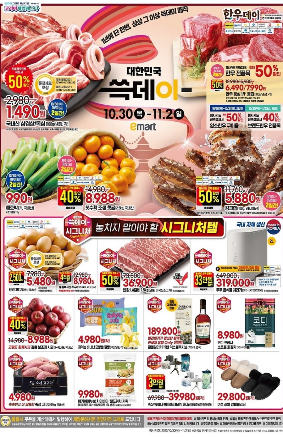 10월 30일부터 11월 2일까지 이마트 쓱데이 행사가 시작됩니다. 이마트 할인 행사에서 어떤 꿀템들 있는지 전단지 잘 확인해 보세요