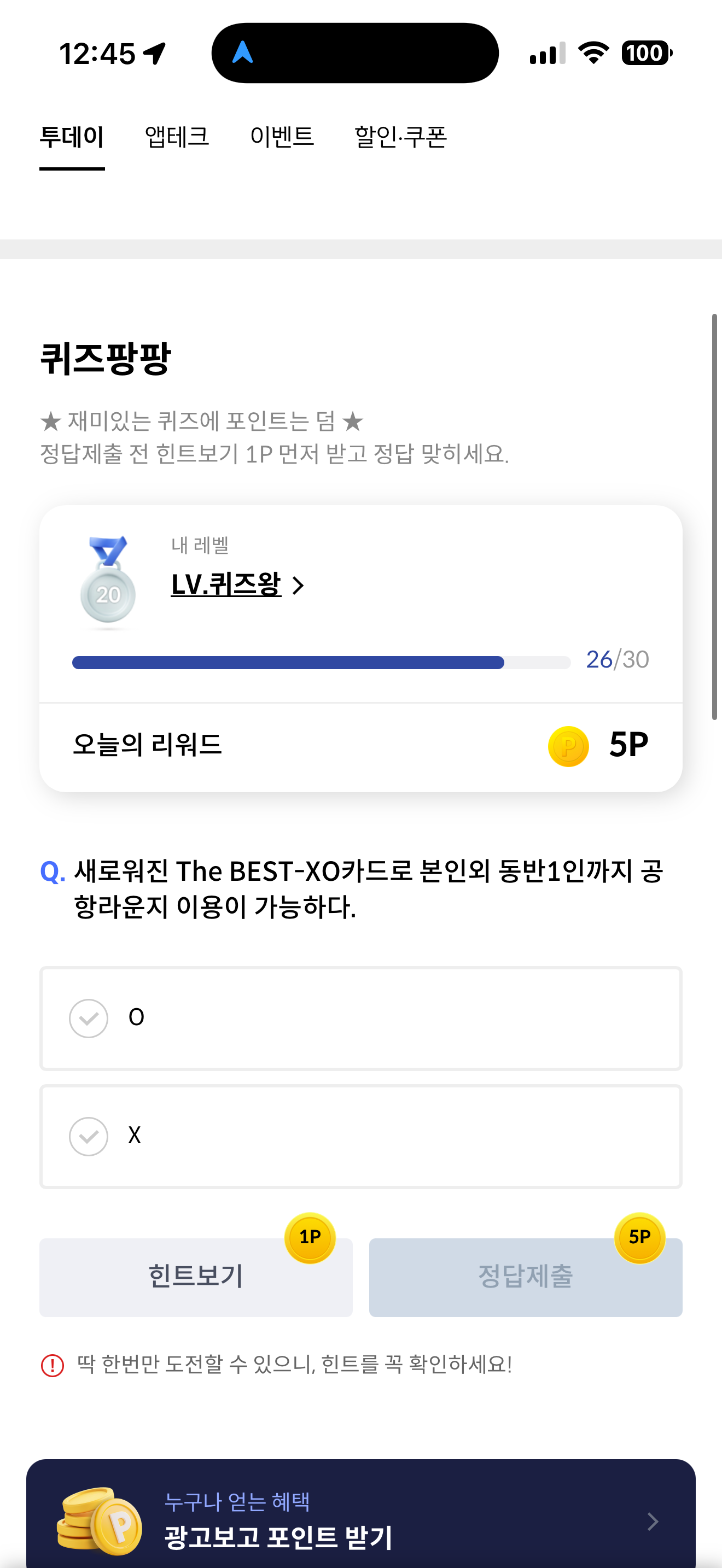 신한카드 퀴즈팡팡 10월 28일 정답(새로워진 The BEST-XO카드로 본인외 동반1인까지 공항라운지 이용이 가능하다)