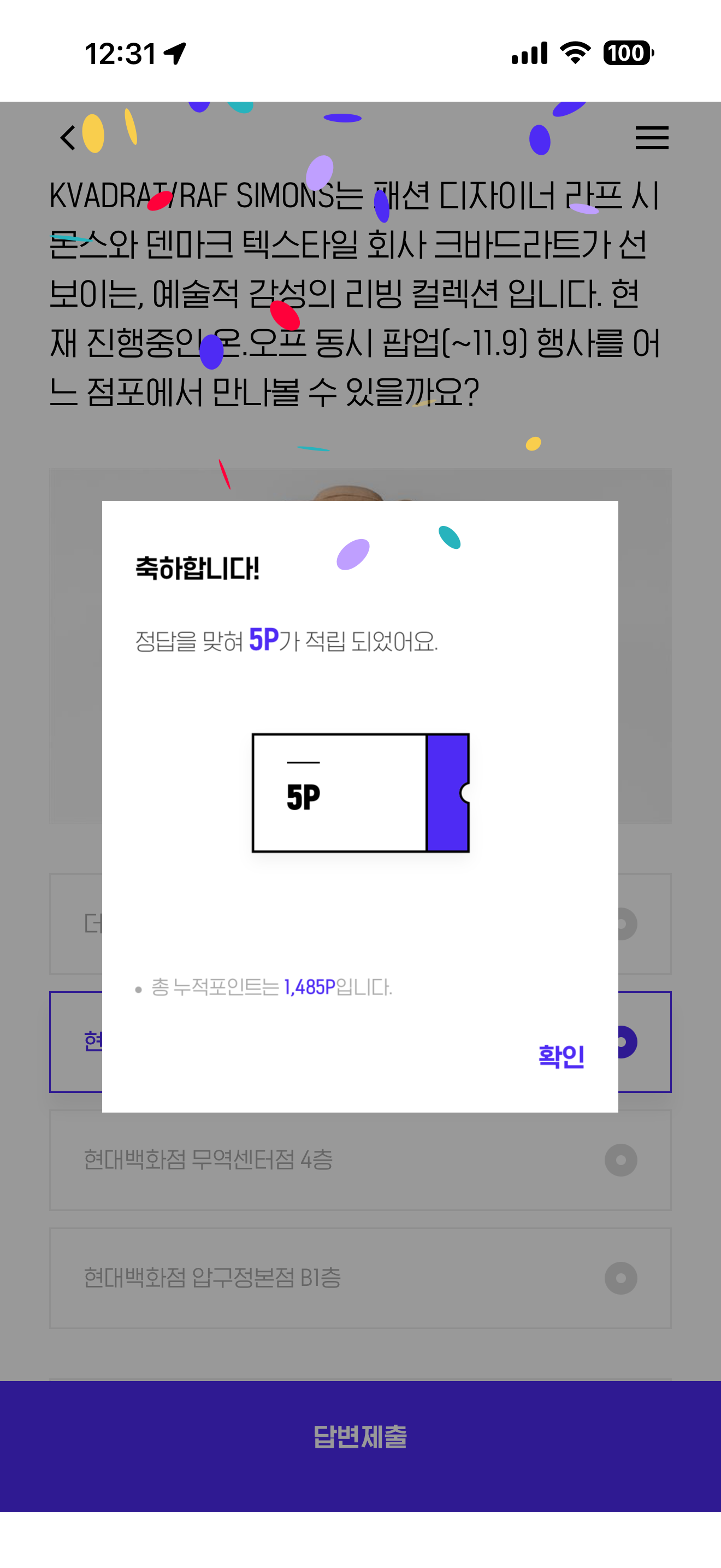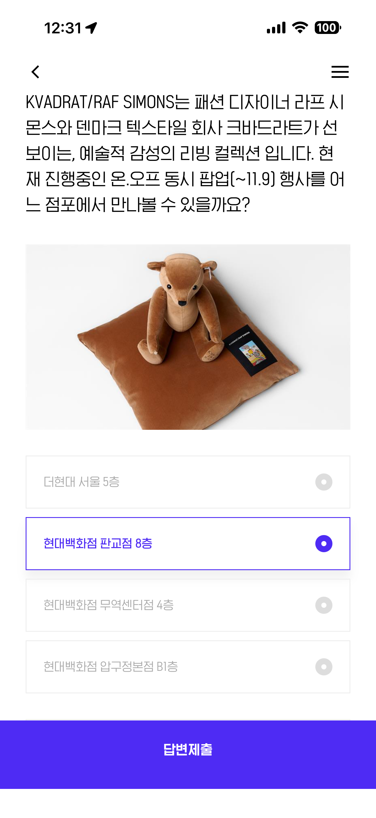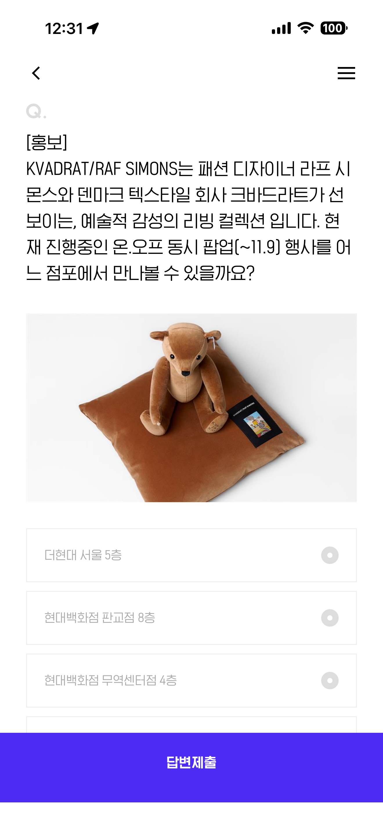 H포인트 퀴즈 10월 29일 정답(KVADRAT/RAF SIMONS는 패션 디자이너 라프 시몬스와 덴마크 텍스타일 회사 크바드라트가 선보이는, 예술적 감성의 리빙 컬렉션 입니다. 현재 진행중인 온 오프 동시 팝업(~11.9) 행사를 어느 점포에서 만나볼 수 있을까요?)