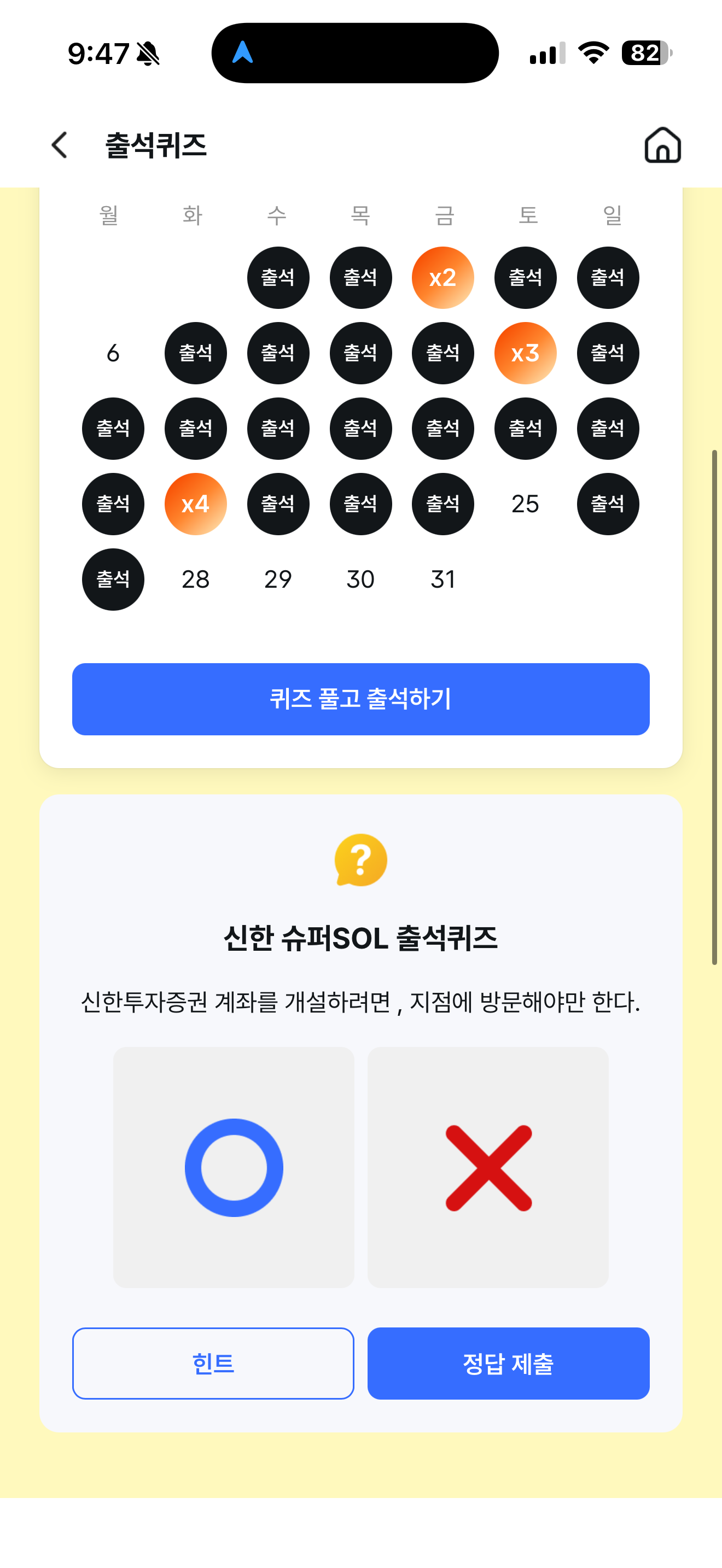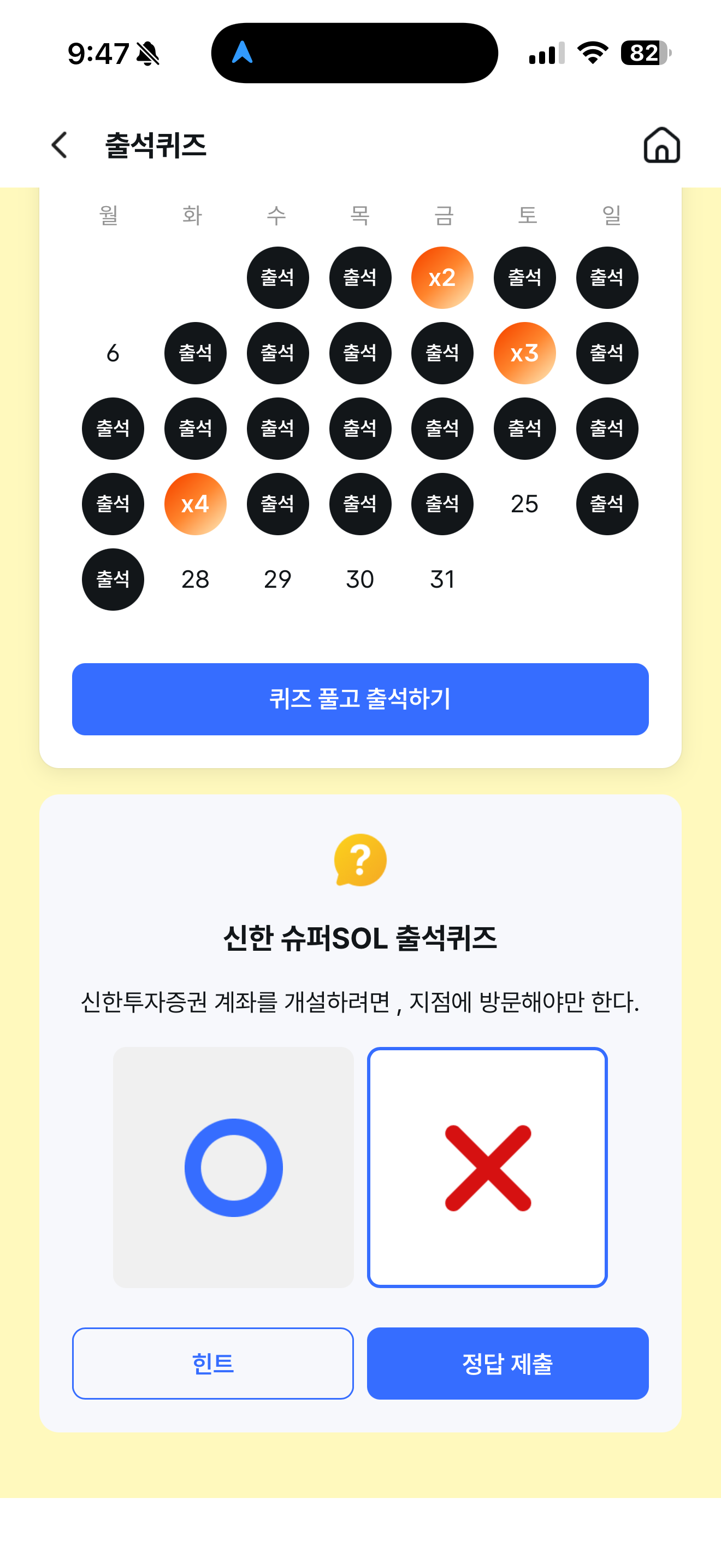 신한 슈퍼SOL 출석퀴즈 정답은 X 입니다