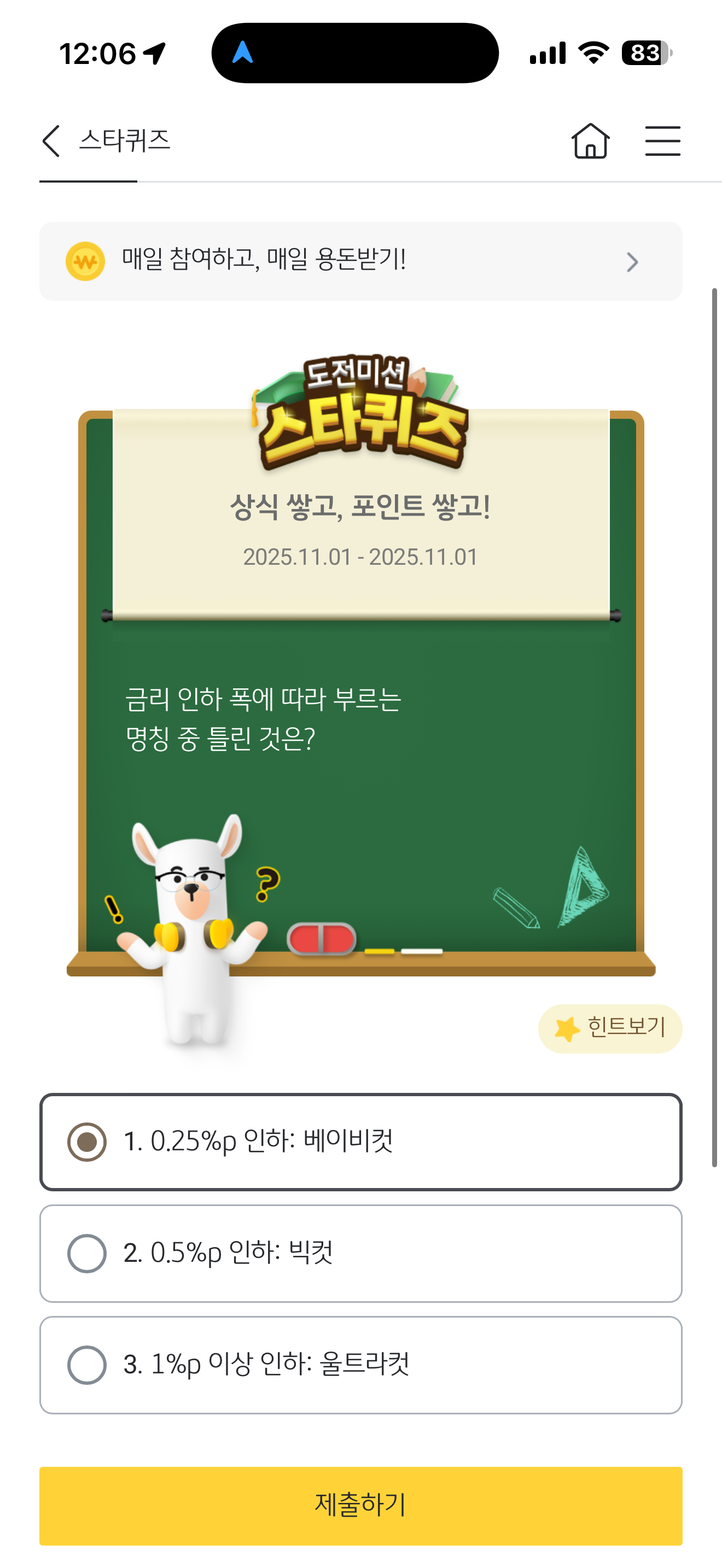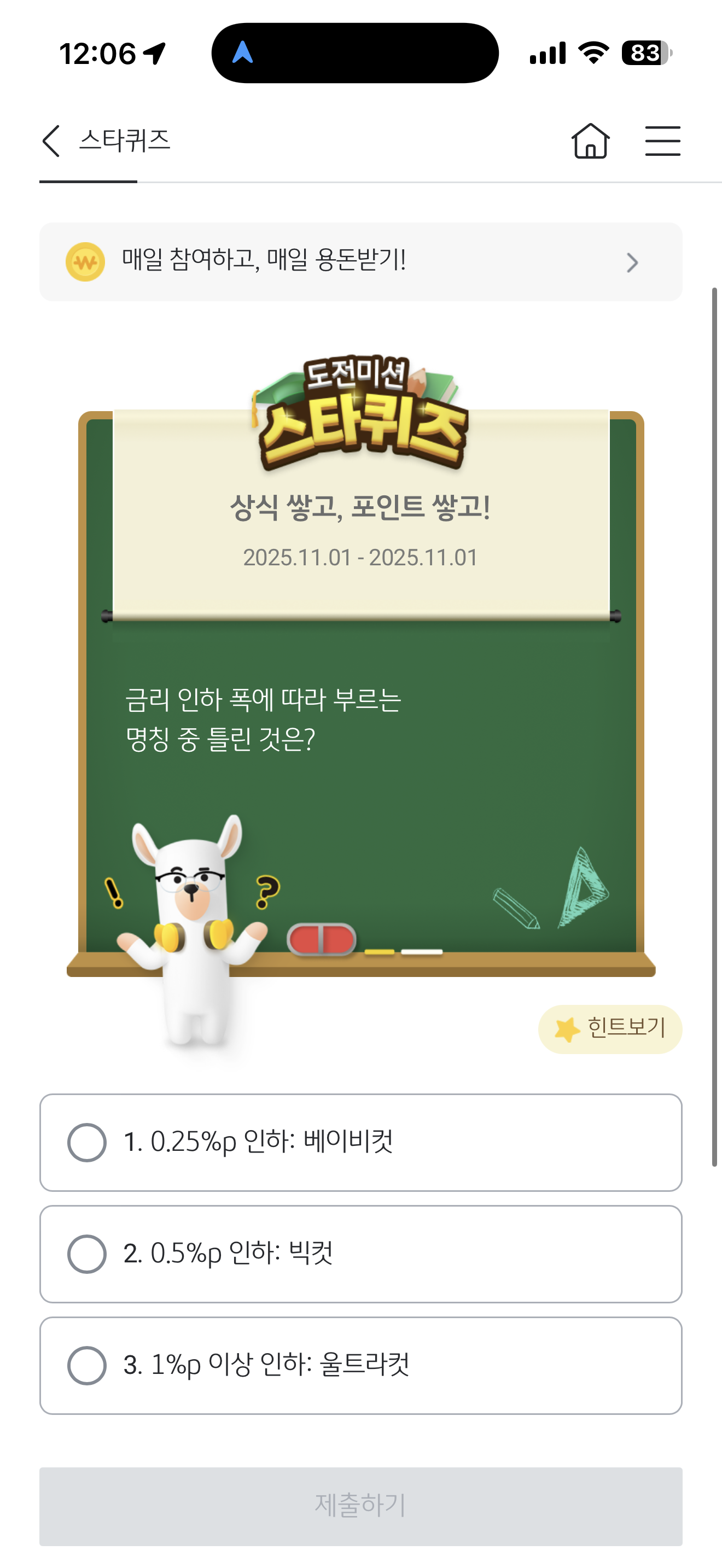 KB스타뱅킹 스타퀴즈 11월 1일 정답(금리 인하 폭에 따라 부르는 명칭 중 틀린 것은?)