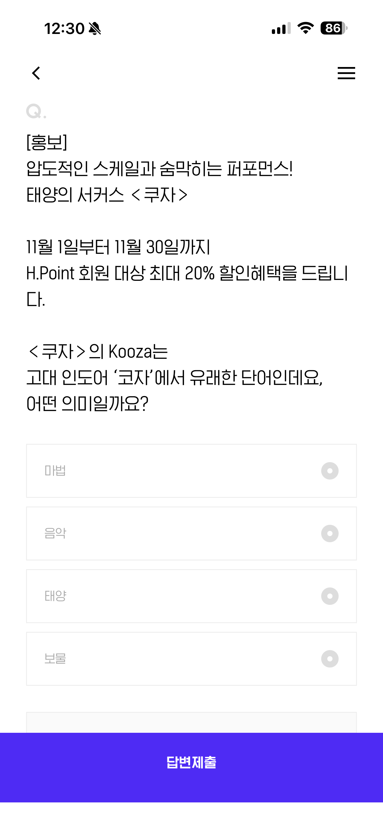 압도적인 스케일과 숨막히는 퍼포먼스! 태양의 서커스 <쿠자> 11월 1일부터 11월 30일까지 H.Point 회원 대상 최대 20% 할인혜택을 드립니다. <쿠자>의 Kooza는 고대 인도어 '코자'에서 유래한 단어인데요, 어떤 의미일까요? 보기는 1. 마법 2. 음악 3. 태양 4. 보물 입니다