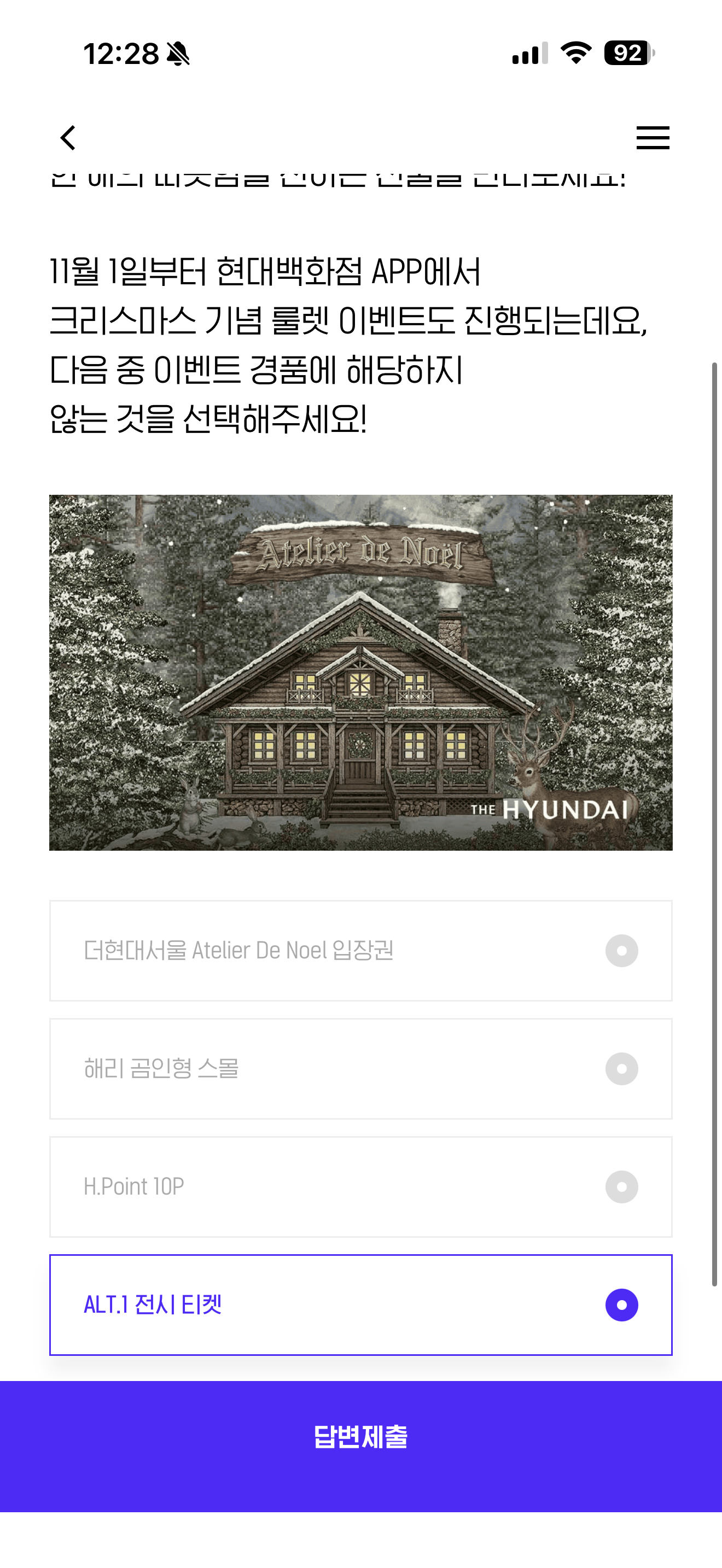 현대백화점 크리스마스 Atelier De Noel 올 겨울 소중한 사람과 함께 해리의 특별한 크리스마스 상점에서 한 해의 따뜻함을 전하는 선물을 만나보세요! 11월 1일부터 현대백화점 APP에서 크리스마스 기념 룰렛 이벤트도 진행되는데요, 다음 중 이벤트 경품에 해당하지 않는 것을 선택해주세요!