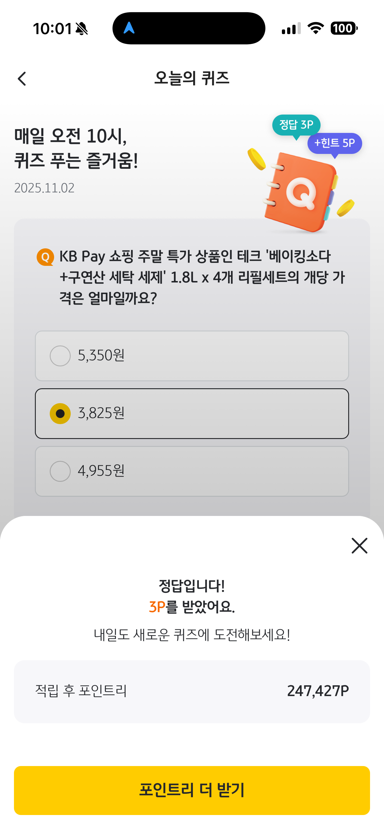 KB pay 오늘의 퀴즈 정답은 3,825원 입니다