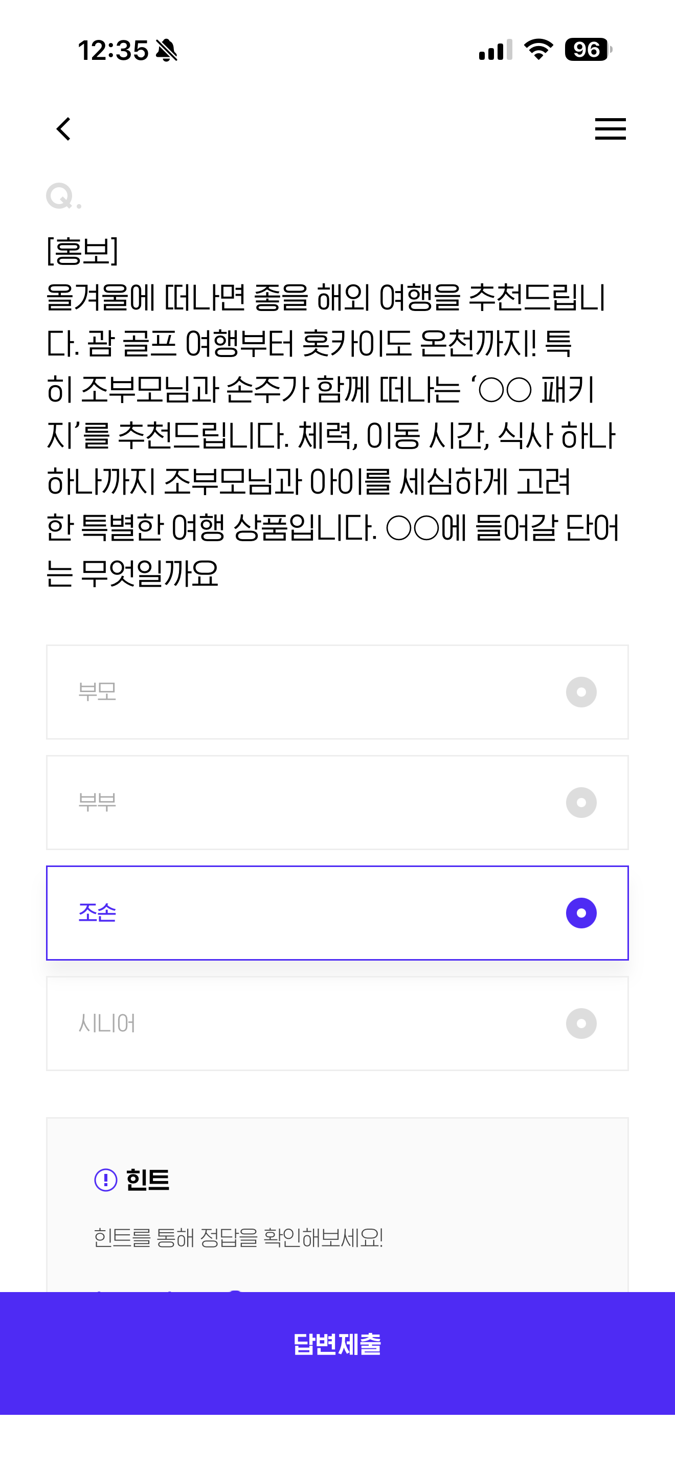 올겨울에 떠나면 좋을 해외 여행을 추천드립니다. 괌 골프 여행부터 홋카이도 온천까지! 특히 조부모님과 손주가 함께 떠나는 'OO 패키지'를 추천드립니다. 체력, 이동 시간, 식사 하나 하나까지 조부모님과 아이를 세심하게 고려한 특별한 여행 상품입니다. OO에 들어갈 단어는 무엇일까요?