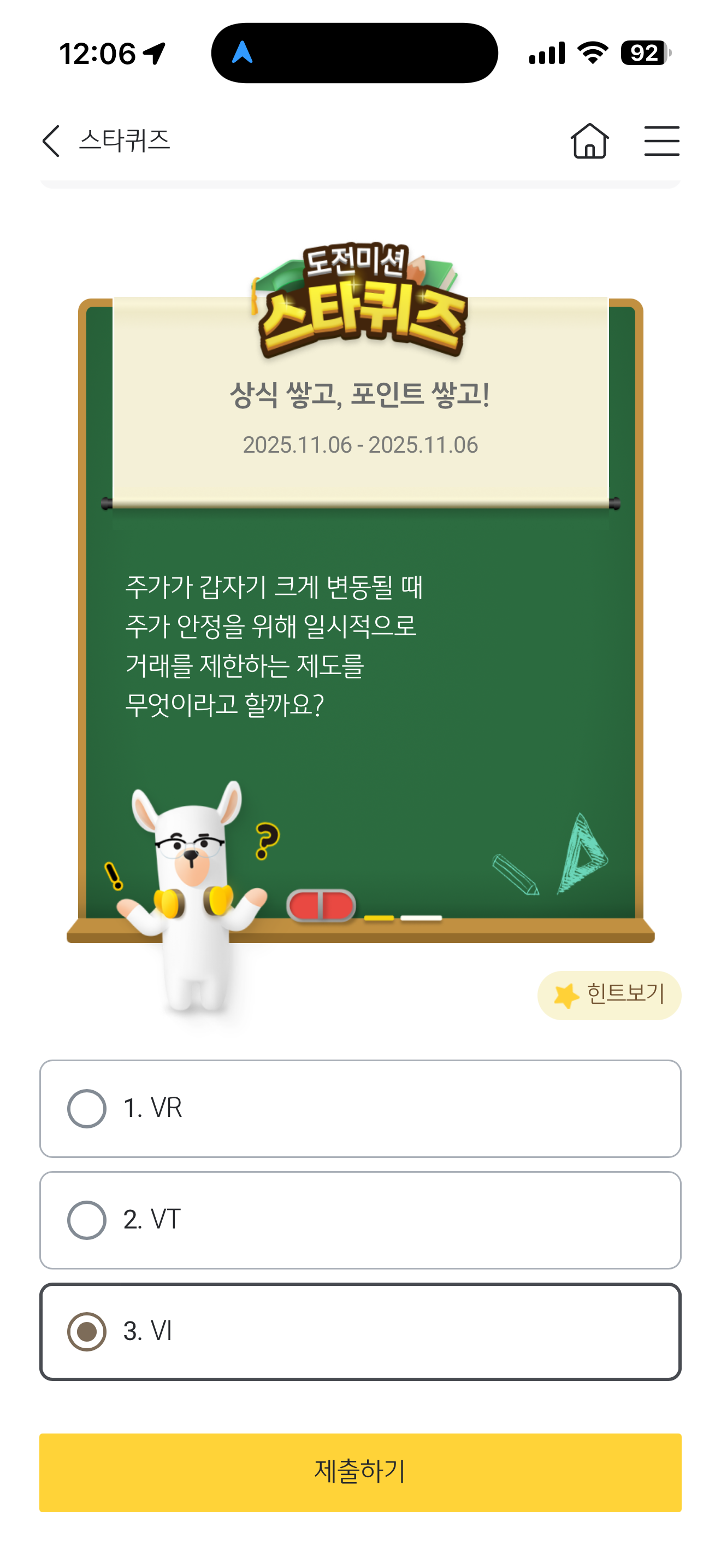 KB스타뱅킹 스타퀴즈 11월 6일 정답(주가가 갑자기 크게 변동될 때 주가 안정을 위해 일시적으로 거래를 제한하는 제도를 무엇이라고 할까요?)